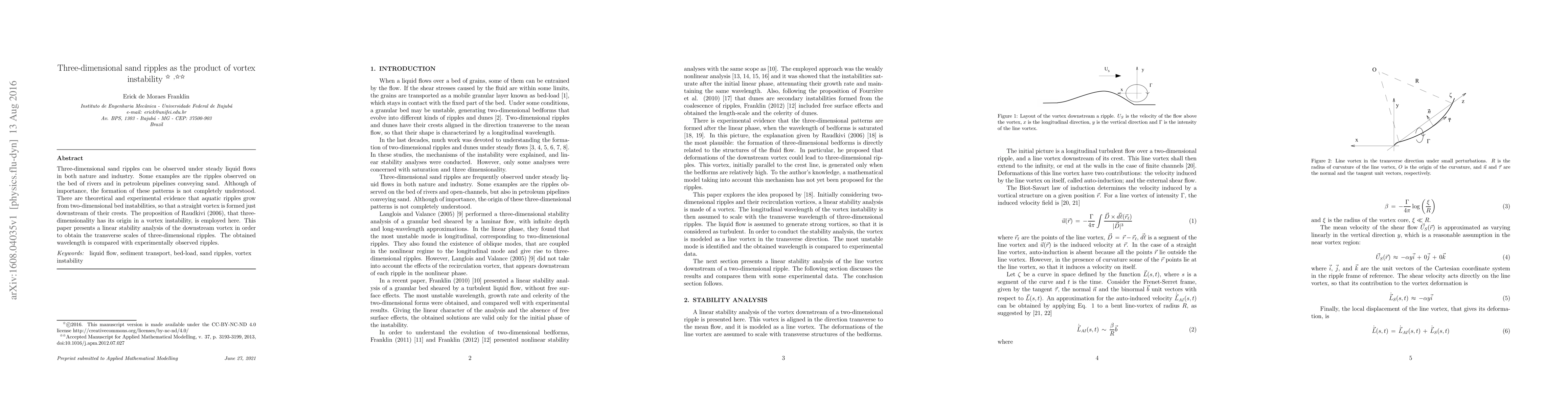 This paper investigates the formation of three-dimensional sand ripples through vortex instability downstream of their crests, employing a linear stability analysis to determine the transverse scales. The theoretical results are compared with experimentally observed ripple wavelengths.