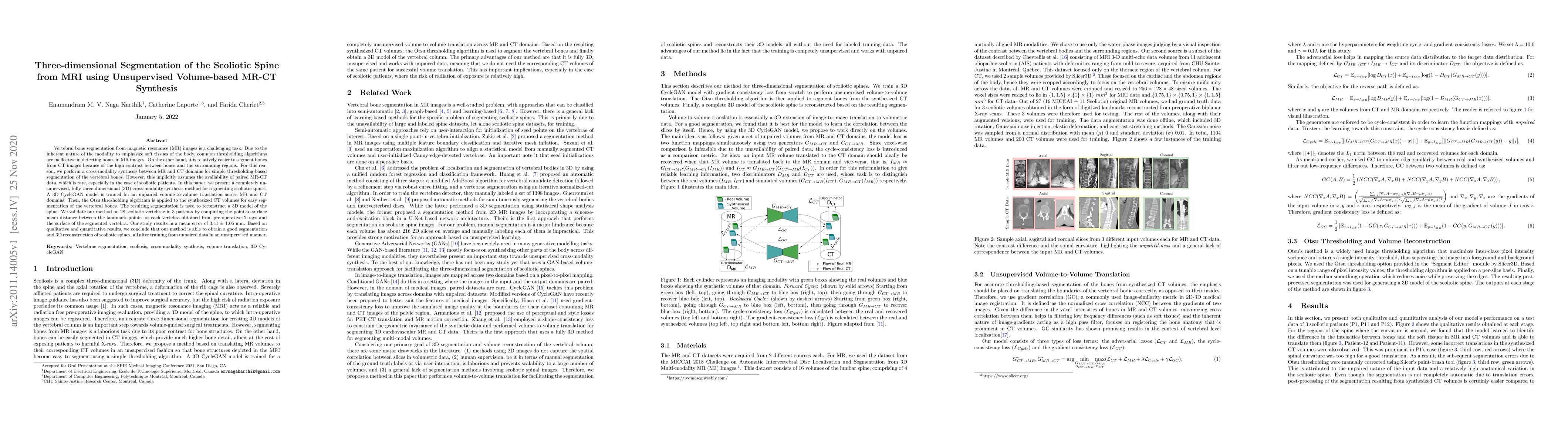 This paper presents an unsupervised method for segmenting scoliotic spines from MRI using unpaired volume-to-volume MR-CT synthesis via a 3D CycleGAN model. The synthesized CT volumes are then thresholded for vertebral bone segmentation, achieving a mean error of 3.41 ± 1.06 mm.