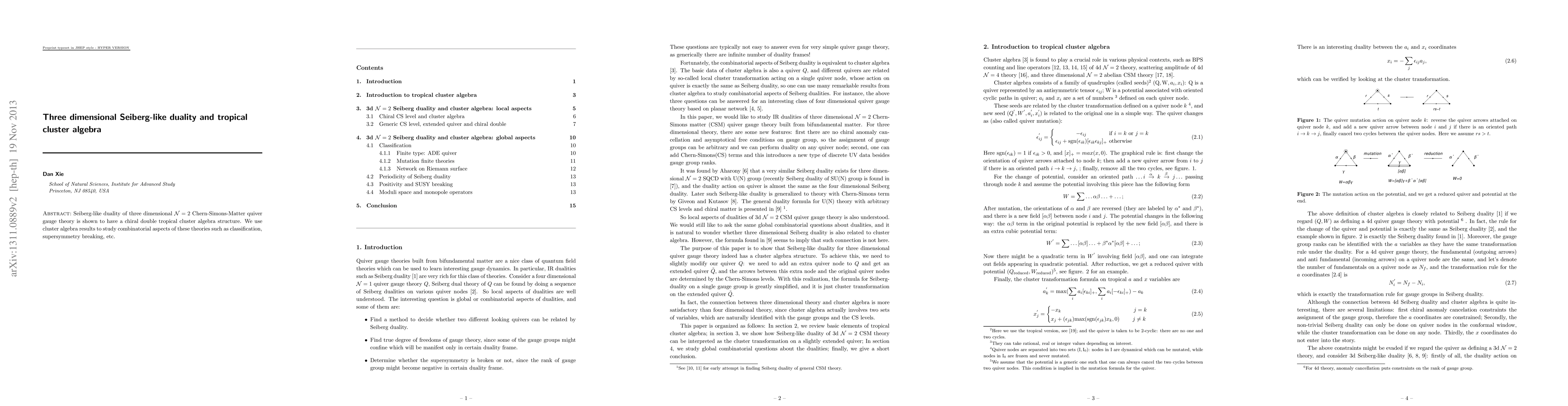 Seiberg-like duality of three dimensional N=2 Chern-Simons-Matter quiver gauge theory is shown to have a chiral double tropical cluster algebra structure. We use cluster algebra results to study combinatorial aspects of these theories such as classification, supersymmetry breaking, etc.