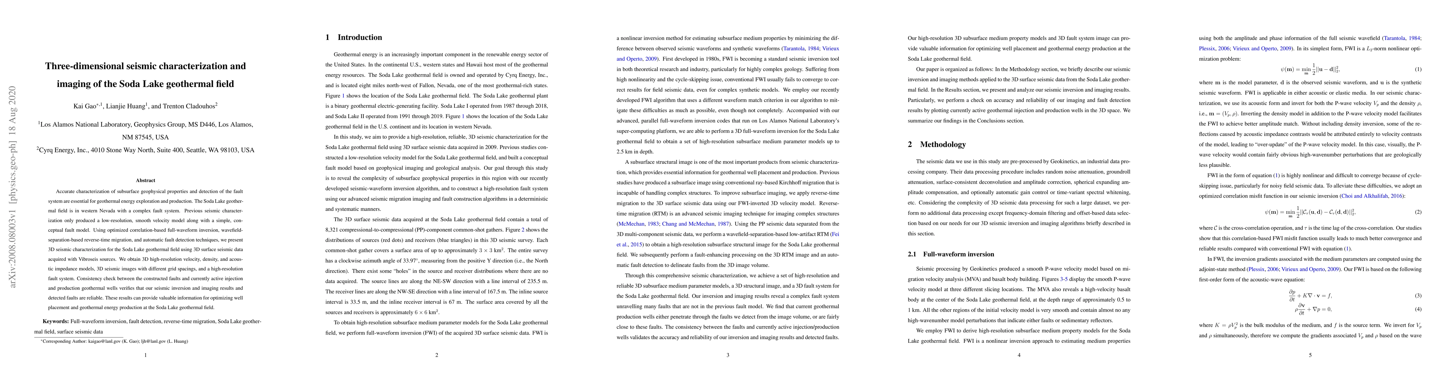 This paper presents a high-resolution 3D seismic characterization of the Soda Lake geothermal field using advanced inversion and imaging techniques, revealing detailed velocity, density, and fault system models that enhance geothermal energy exploration and production optimization. The results are validated by their consistency with existing geothermal wells.
