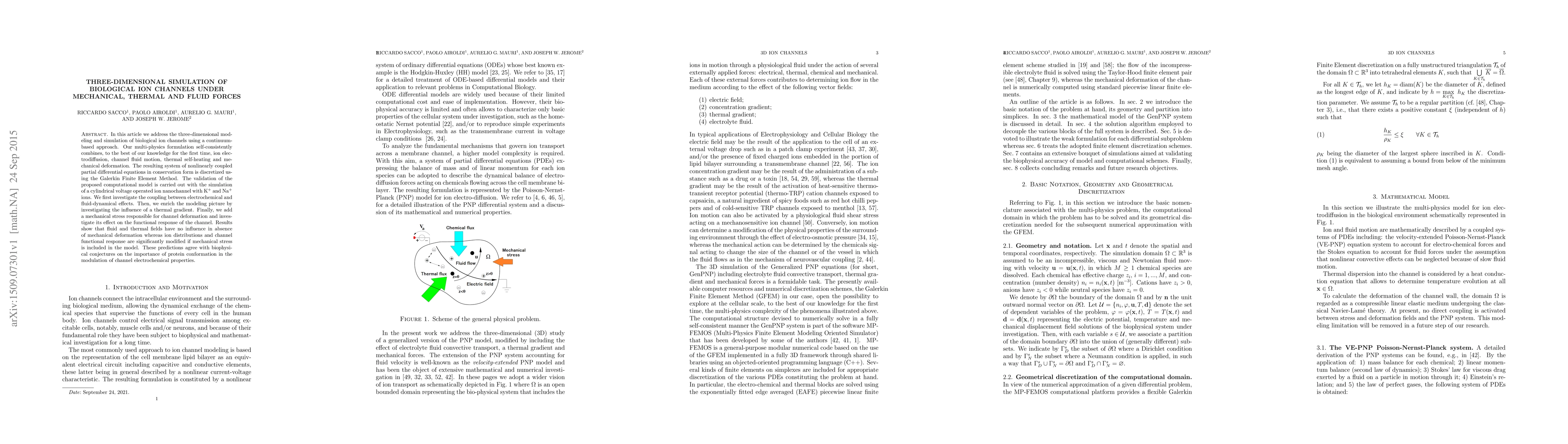 This paper presents a three-dimensional simulation of biological ion channels under mechanical, thermal, and fluid forces using a continuum-based approach. The study combines ion electrodiffusion, fluid dynamics, thermal self-heating, and mechanical deformation, showing significant modifications in ion distributions and channel response under mechanical stress.