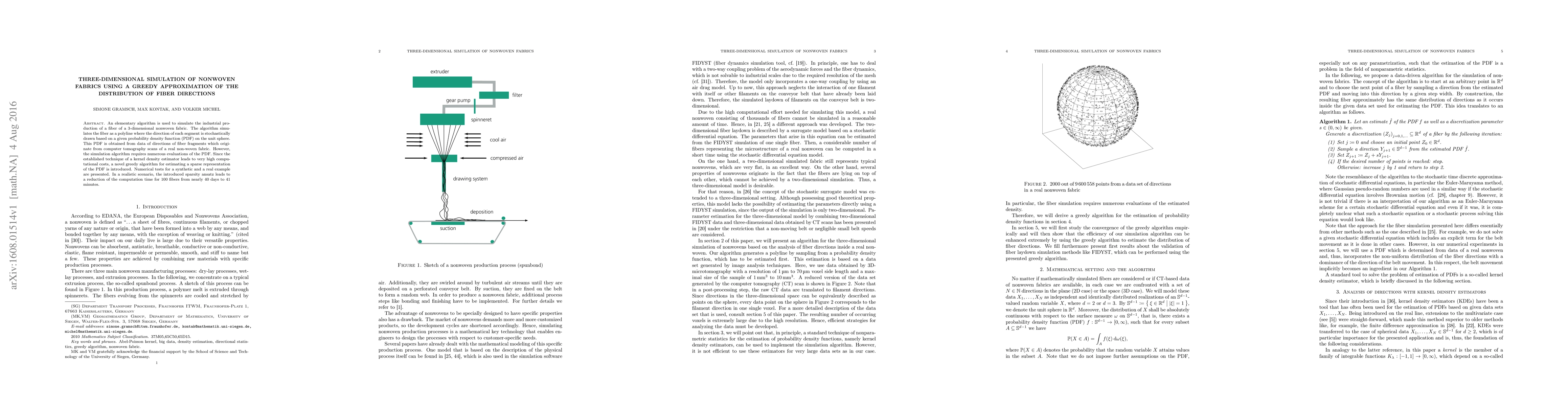 An elementary algorithm is used to simulate the industrial production of a fiber of a 3-dimensional nonwoven fabric. The algorithm simulates the fiber as a polyline where the direction of each segment is stochastically drawn based on a given probability density function (PDF) on the unit sphere. This PDF is obtained from data of directions of fiber fragments which originate from computer tomography scans of a real non-woven fabric. However, the simulation algorithm requires numerous evaluations of the PDF. Since the established technique of a kernel density estimator leads to very high computational costs, a novel greedy algorithm for estimating a sparse representation of the PDF is introduced. Numerical tests for a synthetic and a real example are presented. In a realistic scenario, the introduced sparsity ansatz leads to a reduction of the computation time for 100 fibers from nearly 40 days to 41 minutes.