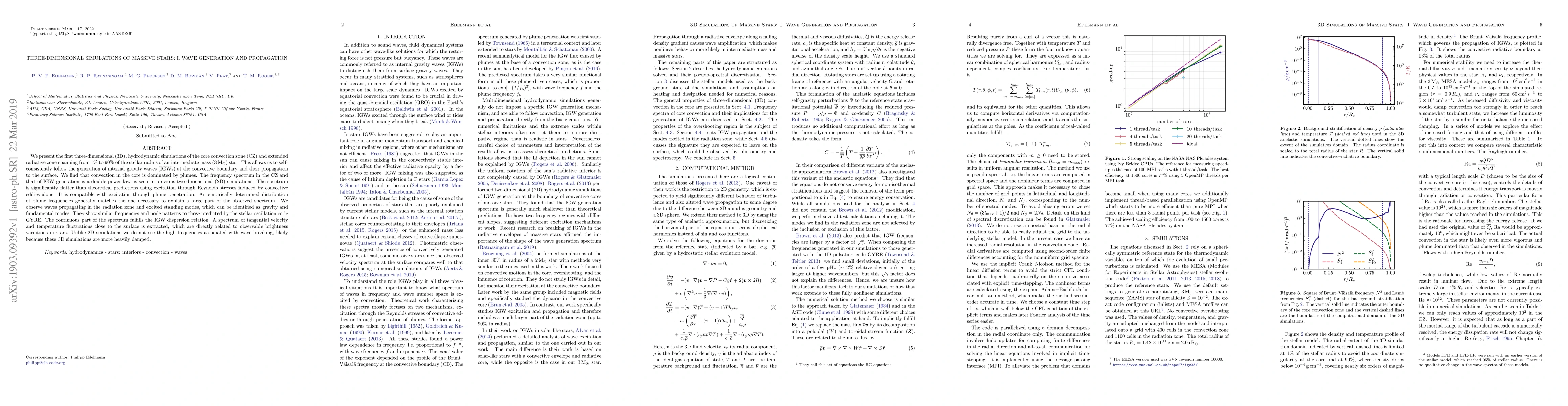 We present the first three-dimensional (3D), hydrodynamic simulations of the core convection zone (CZ) and extended radiative zone spanning from 1% to 90% of the stellar radius of an intermediate mass (3 $\mathrm{M}_\odot$) star. This allows us to self-consistently follow the generation of internal gravity waves (IGWs) at the convective boundary and their propagation to the surface. We find that convection in the core is dominated by plumes. The frequency spectrum in the CZ and that of IGW generation is a double power law as seen in previous two-dimensional (2D) simulations. The spectrum is significantly flatter than theoretical predictions using excitation through Reynolds stresses induced by convective eddies alone. It is compatible with excitation through plume penetration. An empirically determined distribution of plume frequencies generally matches the one necessary to explain a large part of the observed spectrum. We observe waves propagating in the radiation zone and excited standing modes, which can be identified as gravity and fundamental modes. They show similar frequencies and node patterns to those predicted by the stellar oscillation code GYRE. The continuous part of the spectrum fulfills the IGW dispersion relation. A spectrum of tangential velocity and temperature fluctuations close to the surface is extracted, which are directly related to observable brightness variations in stars. Unlike 2D simulations we do not see the high frequencies associated with wave breaking, likely because these 3D simulations are more heavily damped.
