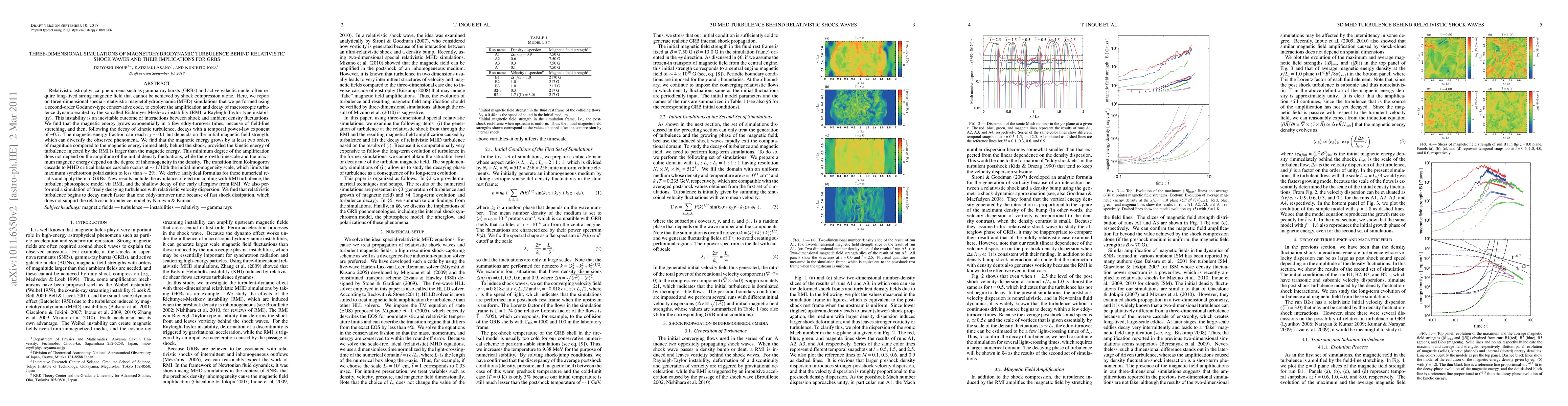 This paper presents three-dimensional special-relativistic MHD simulations exploring turbulence behind relativistic shock waves, revealing significant magnetic field amplification and decay dynamics. The study finds that magnetic energy grows exponentially and can reach a fraction of 0.1, with implications for gamma-ray bursts and the behavior of relativistic turbulence.