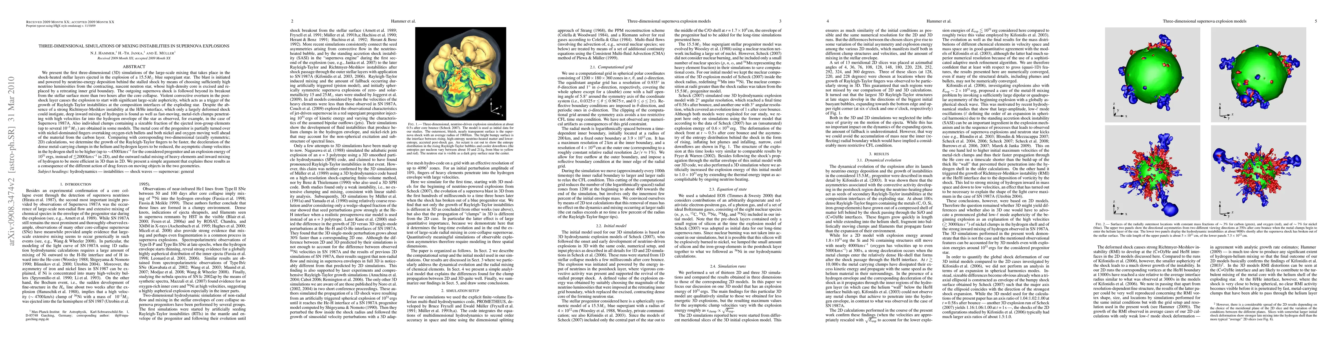 We present the first three-dimensional (3D) simulations of the large-scale mixing that takes place in the shock-heated stellar layers ejected in the explosion of a 15.5 solar-mass blue supergiant star. The outgoing supernova shock is followed from its launch by neutrino heating until it breaks out from the stellar surface more than two hours after the core collapse. Violent convective overturn in the post-shock layer causes the explosion to start with significant asphericity, which triggers the growth of Rayleigh-Taylor (RT) instabilities at the composition interfaces of the exploding star. Deep inward mixing of hydrogen (H) is found as well as fast-moving, metal-rich clumps penetrating with high velocities far into the H-envelope of the star as observed, e.g., in the case of SN 1987A. Also individual clumps containing a sizeable fraction of the ejected iron-group elements (up to several 0.001 solar masses) are obtained in some models. The metal core of the progenitor is partially turned over with Ni-dominated fingers overtaking oxygen-rich bullets and both Ni and O moving well ahead of the material from the carbon layer. Comparing with corresponding 2D (axially symmetric) calculations, we determine the growth of the RT fingers to be faster, the deceleration of the dense metal-carrying clumps in the He and H layers to be reduced, the asymptotic clump velocities in the H-shell to be higher (up to ~4500 km/s for the considered progenitor and an explosion energy of 10^{51} ergs, instead of <2000 km/s in 2D), and the outward radial mixing of heavy elements and inward mixing of hydrogen to be more efficient in 3D than in 2D. We present a simple argument that explains these results as a consequence of the different action of drag forces on moving objects in the two geometries. (abridged)