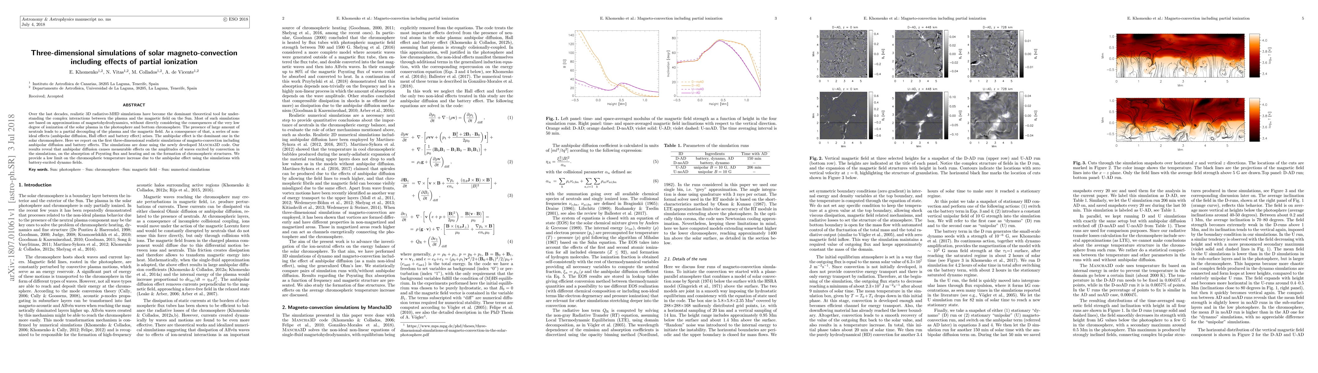 Title: Three-dimensional simulations of solar magneto-convection including effects of partial ionization Summary: This study presents the first 3D MHD simulations incorporating partial ionization effects in solar plasma, revealing significant impacts on wave amplitudes, Poynting flux absorption, chromospheric heating, and structure formation due to ambipolar diffusion and battery effects.
