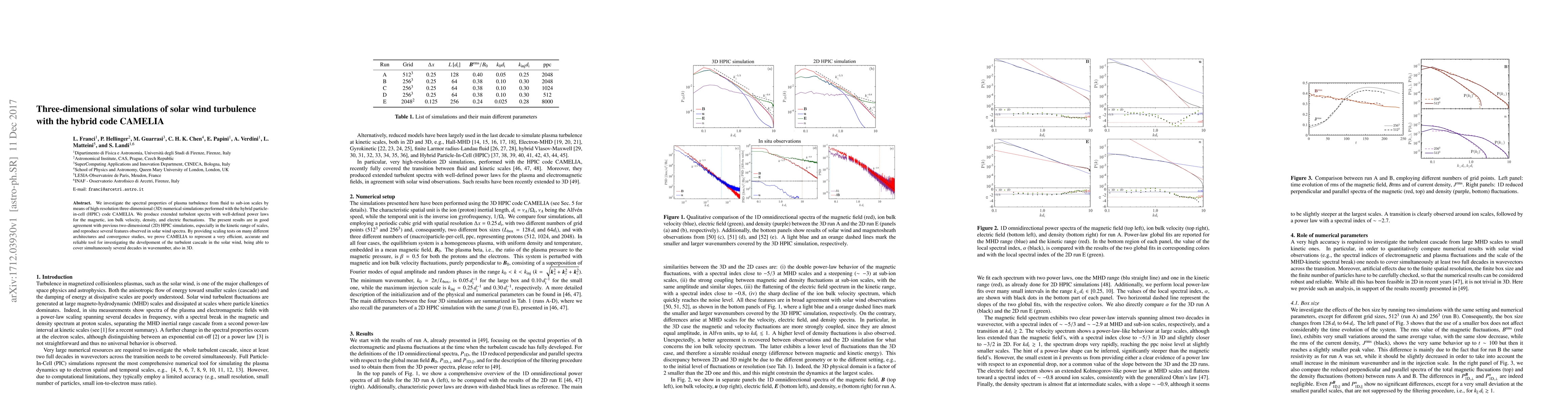 We investigate the spectral properties of plasma turbulence from fluid to sub-ion scales by means of high-resolution three-dimensional (3D) numerical simulations performed with the hybrid particle-in-cell (HPIC) code CAMELIA. We produce extended turbulent spectra with well-defined power laws for the magnetic, ion bulk velocity, density, and electric fluctuations. The present results are in good agreement with previous two-dimensional (2D) HPIC simulations, especially in the kinetic range of scales, and reproduce several features observed in solar wind spectra. By providing scaling tests on many different architectures and convergence studies, we prove CAMELIA to represent a very efficient, accurate and reliable tool for investigating the develpoment of the turbulent cascade in the solar wind, being able to cover simultaneously several decades in wavenumber, also in 3D.