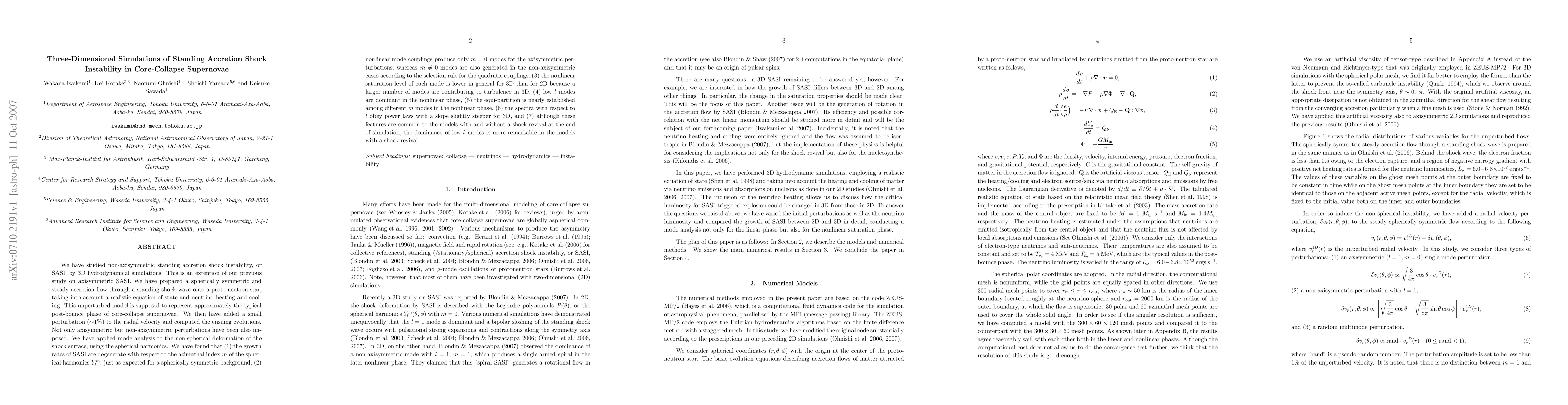 This paper presents 3D hydrodynamic simulations of the standing accretion shock instability (SASI) in core-collapse supernovae, extending previous axisymmetric studies. The simulations reveal that non-axisymmetric perturbations generate m≠0 modes, and low l modes dominate the nonlinear phase, with equi-partition among m modes and steeper power law spectra in 3D compared to 2D.