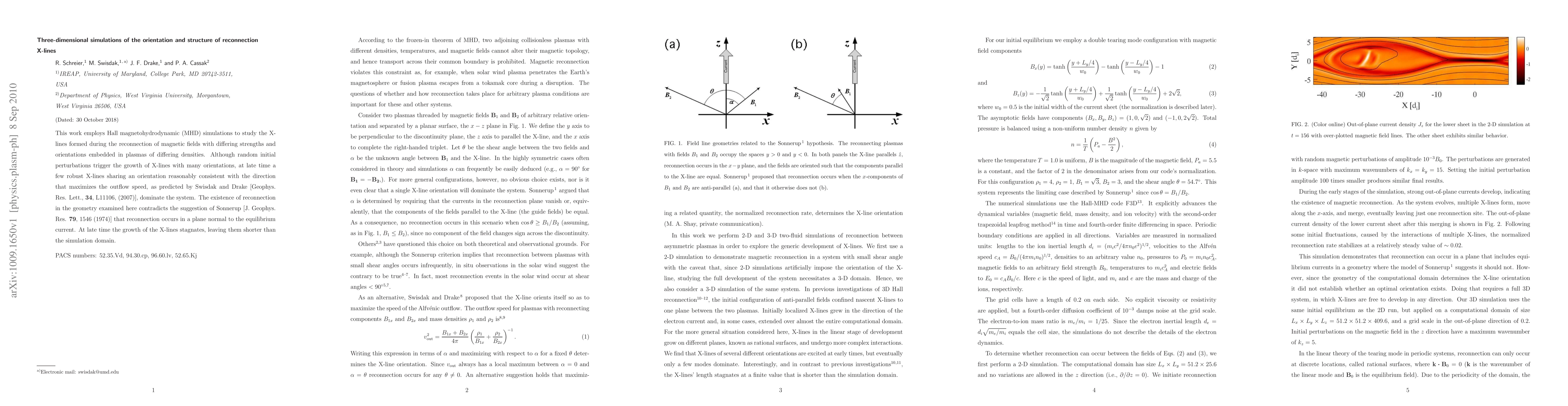 This work employs Hall magnetohydrodynamic (MHD) simulations to study the X-lines formed during the reconnection of magnetic fields with differing strengths and orientations embedded in plasmas of differing densities. Although random initial perturbations trigger the growth of X-lines with many orientations, at late time a few robust X-lines sharing an orientation reasonably consistent with the direction that maximizes the outflow speed, as predicted by Swisdak and Drake [Geophys. Res. Lett., 34, L11106, (2007)], dominate the system. The existence of reconnection in the geometry examined here contradicts the suggestion of Sonnerup [J. Geophys. Res., 79, 1546 (1974)] that reconnection occurs in a plane normal to the equilibrium current. At late time the growth of the X-lines stagnates, leaving them shorter than the simulation domain.