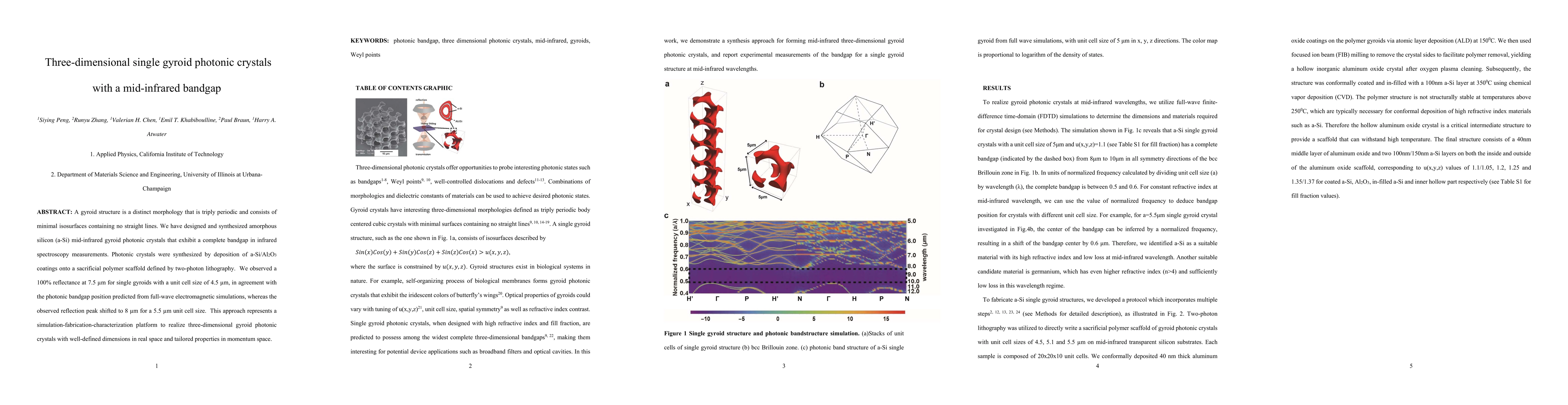 This paper details the design and synthesis of amorphous silicon mid-infrared gyroid photonic crystals with a complete bandgap, achieved via a-Si/Al2O3 coatings on a polymer scaffold. The crystals exhibit high reflectance at specific wavelengths, confirming the predicted photonic bandgap from simulations.