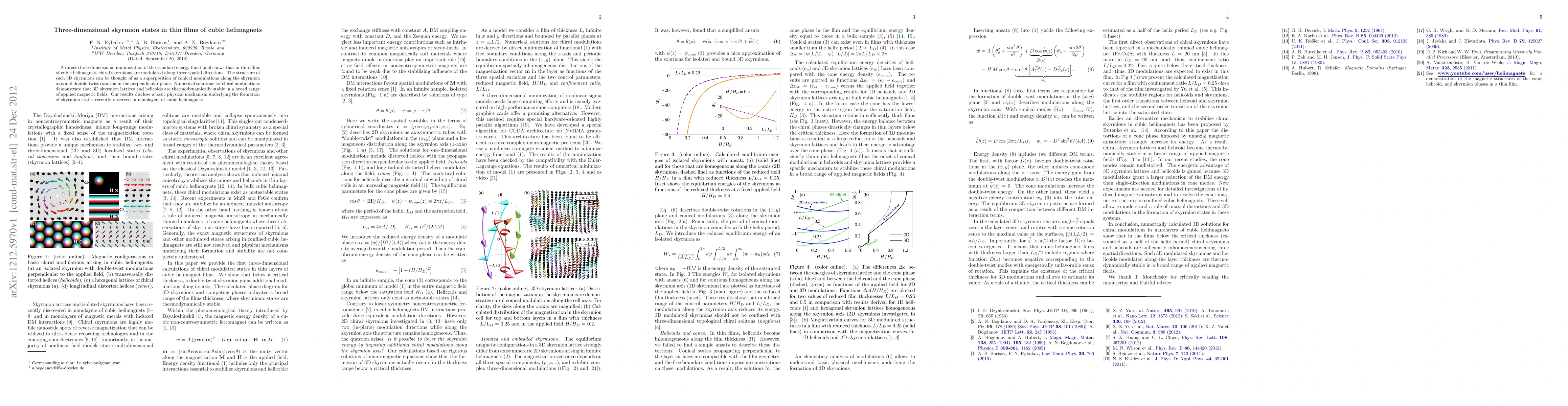 This paper demonstrates that thin films of cubic helimagnets host stable three-dimensional skyrmion states, characterized by conical modulations along the skyrmion axis and double-twist rotations in the perpendicular plane, providing a mechanism for the observed skyrmion states in nanolayers. Numerical solutions confirm the thermodynamic stability of these 3D skyrmion lattices and helicoids across various magnetic fields.