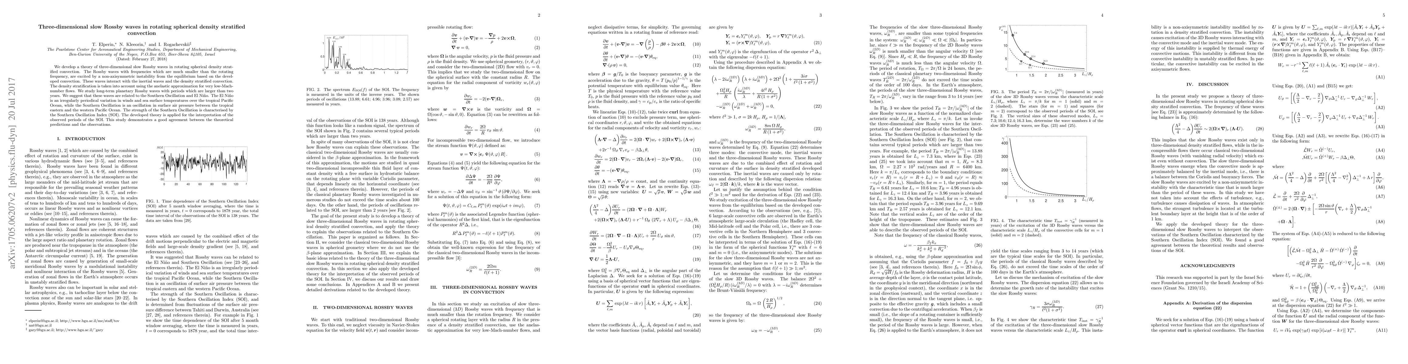This paper develops a theoretical framework for three-dimensional slow Rossby waves in rotating, spherical density stratified convection, linking these waves to the Southern Oscillation and El Niño, and showing good agreement between theoretical predictions and observed Southern Oscillation Index periods.