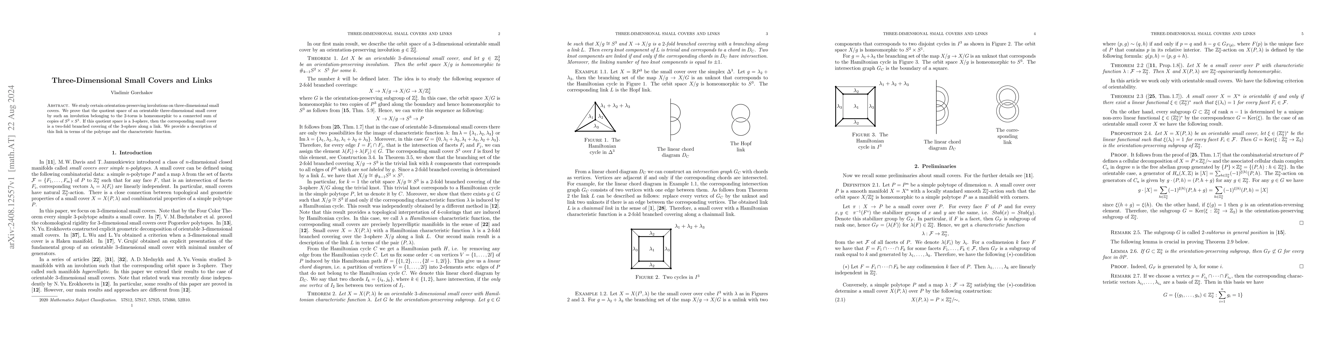 Summary: This paper investigates orientation-preserving involutions on three-dimensional small covers, proving that their quotient space is homeomorphic to a connected sum of $S^2 \times S^1$; it also describes the resulting link when this quotient is a 3-sphere, relating it to the polytope and characteristic function.