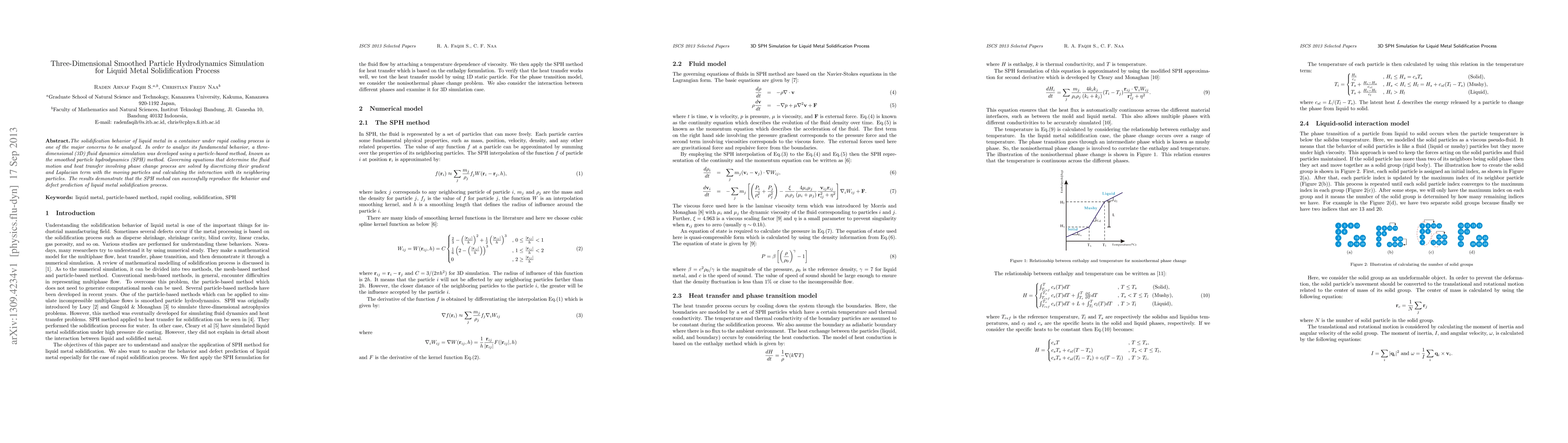 This paper presents a 3D smoothed particle hydrodynamics (SPH) simulation to analyze the solidification behavior of liquid metal under rapid cooling. The SPH method effectively reproduces the fundamental behavior and predicts defects in the liquid metal solidification process.