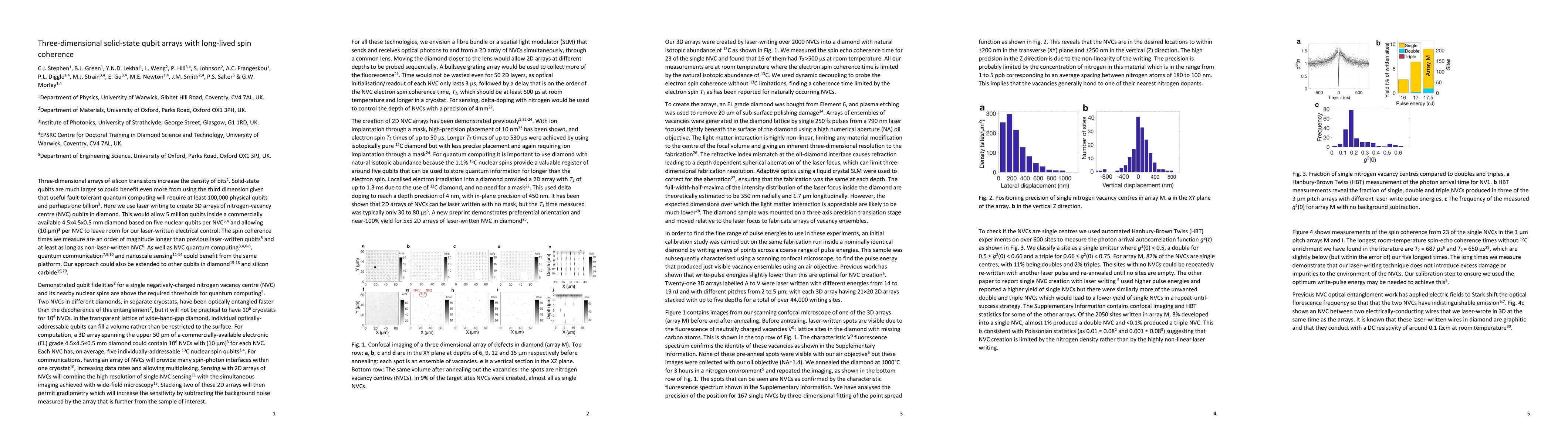 Three-dimensional arrays of silicon transistors increase the density of bits. Solid-state qubits are much larger so could benefit even more from using the third dimension given that useful fault-tolerant quantum computing will require at least 100,000 physical qubits and perhaps one billion. Here we use laser writing to create 3D arrays of nitrogen-vacancy centre (NVC) qubits in diamond. This would allow 5 million qubits inside a commercially available 4.5x4.5x0.5 mm diamond based on five nuclear qubits per NVC and allowing $(10 \mu m)^3$ per NVC to leave room for our laser-written electrical control. The spin coherence times we measure are an order of magnitude longer than previous laser-written qubits and at least as long as non-laser-written NVC. As well as NVC quantum computing, quantum communication and nanoscale sensing could benefit from the same platform. Our approach could also be extended to other qubits in diamond and silicon carbide.