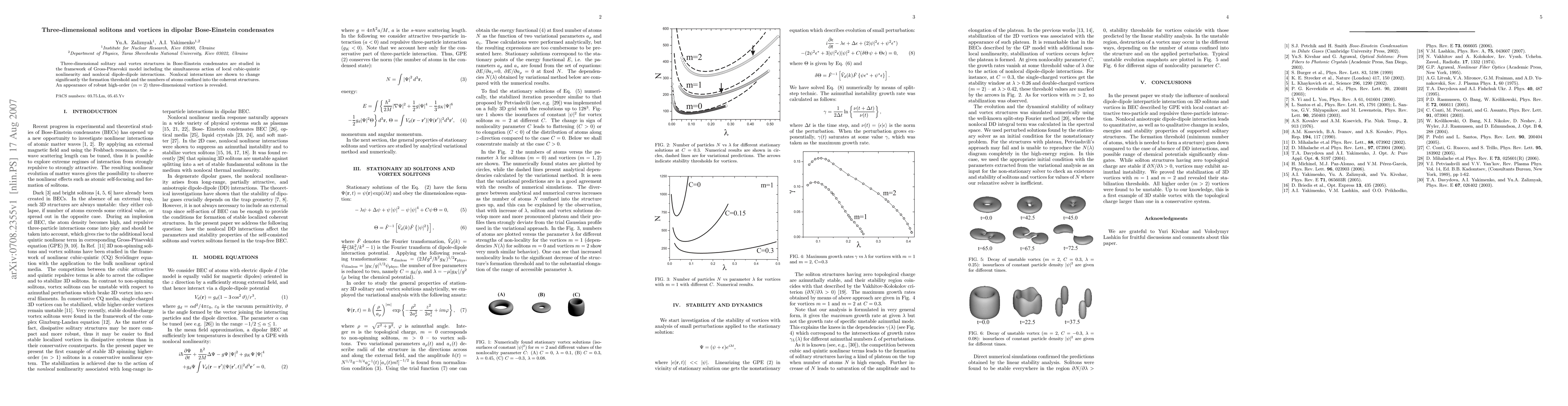 This study investigates three-dimensional solitons and vortices in dipolar Bose-Einstein condensates using the Gross-Pitaevskii model, highlighting how nonlocal dipole-dipole interactions alter formation thresholds and atom confinement, and discovering robust high-order three-dimensional vortices.