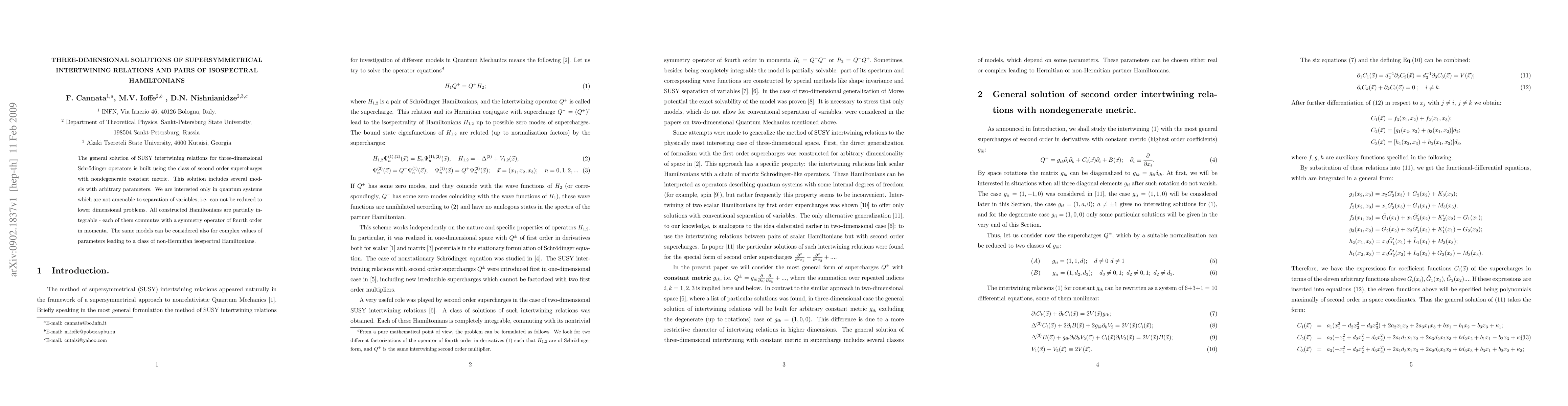 The general solution of SUSY intertwining relations for three-dimensional Schr\"odinger operators is built using the class of second order supercharges with nondegenerate constant metric. This solution includes several models with arbitrary parameters. We are interested only in quantum systems which are not amenable to separation of variables, i.e. can not be reduced to lower dimensional problems. All constructed Hamiltonians are partially integrable - each of them commutes with a symmetry operator of fourth order in momenta. The same models can be considered also for complex values of parameters leading to a class of non-Hermitian isospectral Hamiltonians.