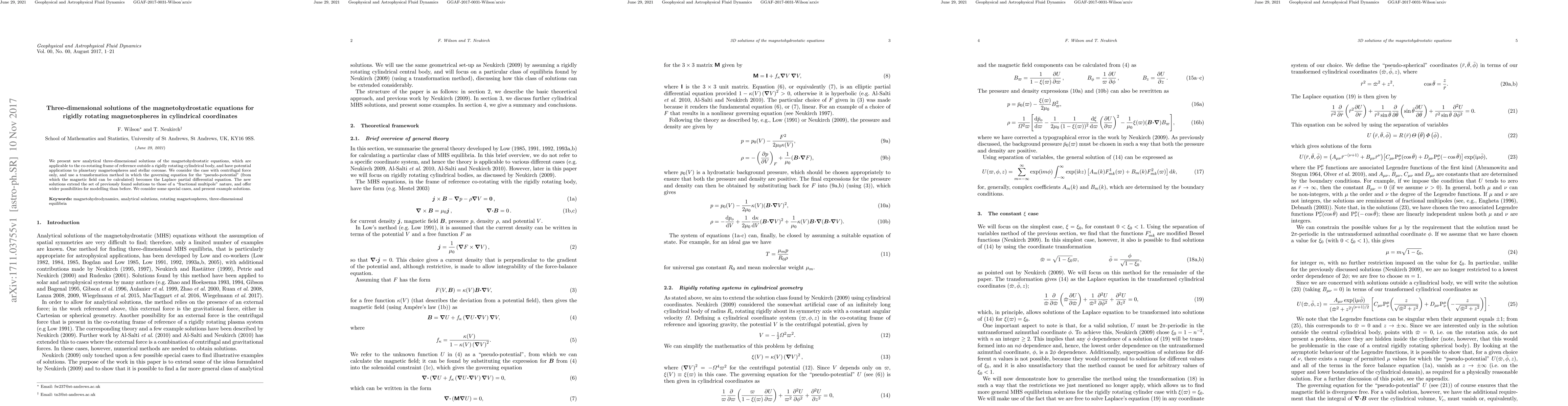 This paper presents new analytical three-dimensional solutions of magnetohydrostatic equations for rigidly rotating magnetospheres in cylindrical coordinates, extending previous solutions to include "fractional multipole" nature. The solutions are applicable to planetary magnetospheres and stellar coronae, using a transformation method that simplifies the governing equation to a Laplace partial differential equation.
