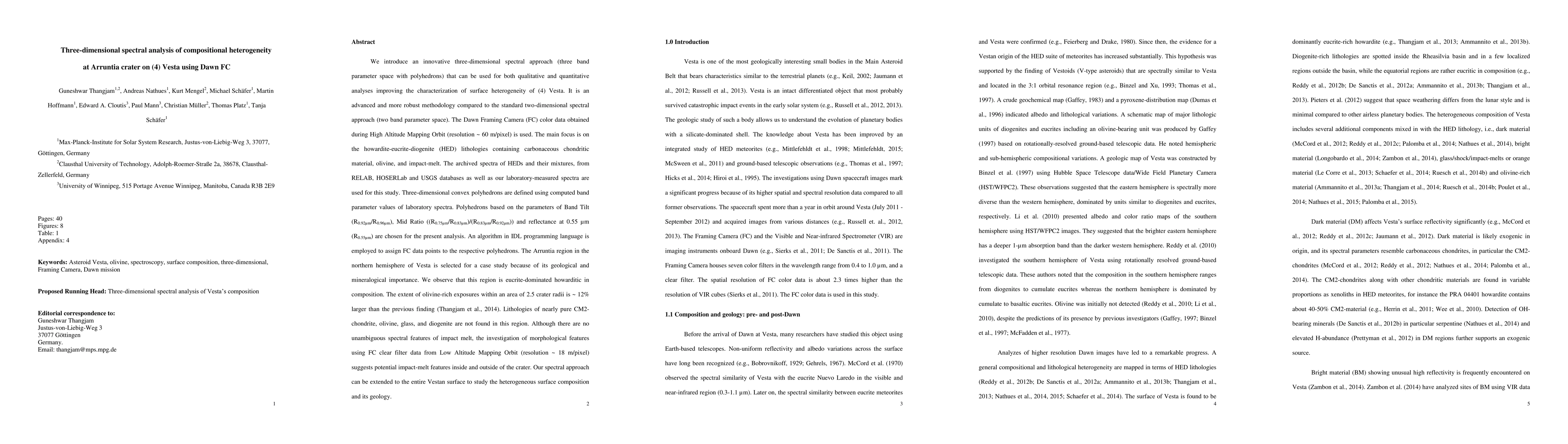 This paper introduces a three-dimensional spectral analysis method using Dawn FC data to characterize compositional heterogeneity at Arruntia crater on Vesta, focusing on HED lithologies. The approach, based on three-band parameters and polyhedrons, reveals a 12% larger olivine-rich area than previous findings, highlighting the method's improved robustness over traditional two-dimensional spectral analysis.