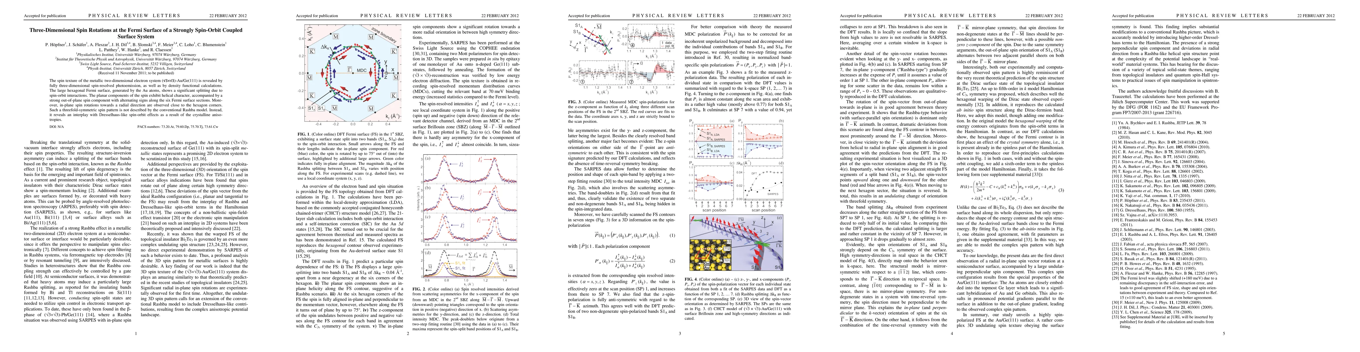 The spin texture of the metallic two-dimensional electron system (root3 x root3)-Au/Ge(111) is revealed by fully three-dimensional spin-resolved photoemission, as well as by density functional calculations. The large hexagonal Fermi surface, generated by the Au atoms, shows a significant splitting due to spin-orbit interactions. The planar components of the spin exhibit helical character, accompanied by a strong out-of-plane spin component with alternating signs along the six Fermi surface sections. Moreover, in-plane spin rotations towards a radial direction are observed close to the hexagon corners. Such a threefold-symmetric spin pattern is not described by the conventional Rashba model. Instead, it reveals an interplay with Dresselhaus-like spin-orbit effects as a result of the crystalline anisotropies.