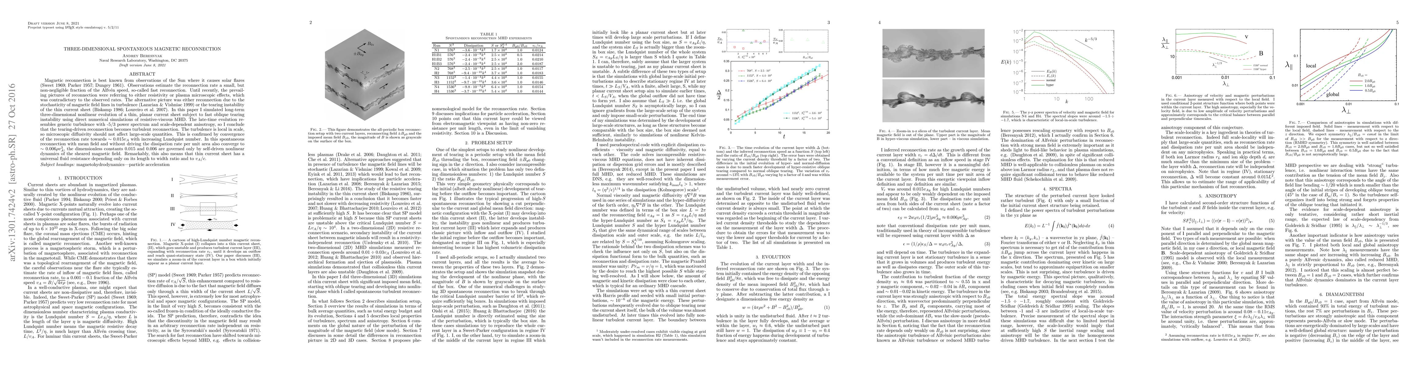Magnetic reconnection is best known from observations of the Sun where it causes solar flares. Observations estimate the reconnection rate a small, but non-negligible fraction of the Alfv\'en speed, so-called fast reconnection. Until recently, the prevailing pictures of reconnection were referring to either resistivity or plasma microscopic effects, which was contradictory to the observed rates. The alternative picture was either reconnection due to the stochasticity of magnetic field lines in turbulence or the tearing instability of the thin current sheet. In this paper I simulated long-term three-dimensional nonlinear evolution of a thin, planar current sheet subject to fast oblique tearing instability using direct numerical simulations of resistive-viscous MHD. The late-time evolution resembles generic turbulence with -5/3 power spectrum and scale-dependent anisotropy, so I conclude that the tearing-driven reconnection becomes turbulent reconnection. The turbulence is local in scale, so microscopic diffusivity should not affect large-scale quantities. This is confirmed by convergence of the reconnection rate towards $\sim 0.015 v_A$ with increasing Lundquist number. In this spontaneous reconnection with mean field and without driving the dissipation rate per unit area also converge to $\sim 0.006 \rho v_A^3$, the dimensionless constants $0.015$ and $0.006$ are governed only by self-driven nonlinear dynamics of the sheared magnetic field. Remarkably, this also means that thin current sheet has a universal fluid resistance depending only on its length to width ratio and to $v_A/c$.