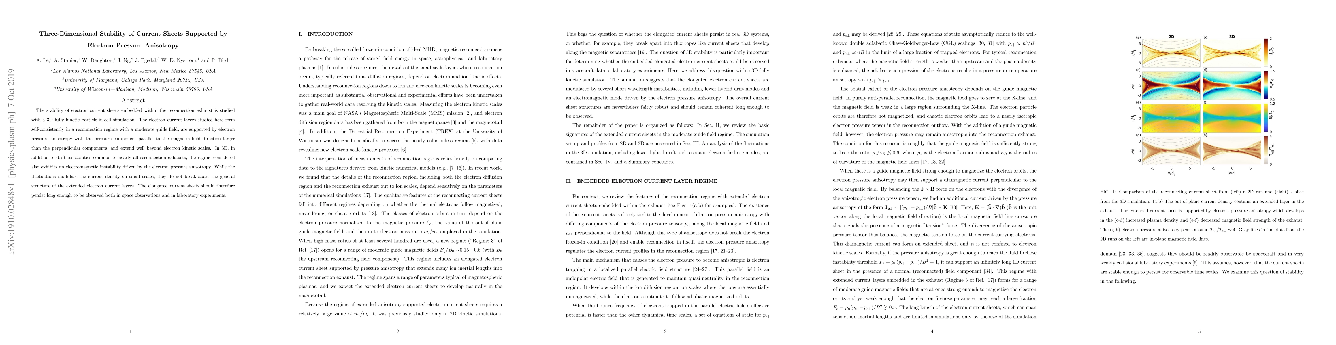 This paper investigates the three-dimensional stability of electron current sheets supported by electron pressure anisotropy using 3D kinetic simulations. It finds that these current sheets, formed in reconnection regimes, exhibit electromagnetic instabilities but maintain their structure, suggesting they could persist long enough for observation in space and laboratory settings.