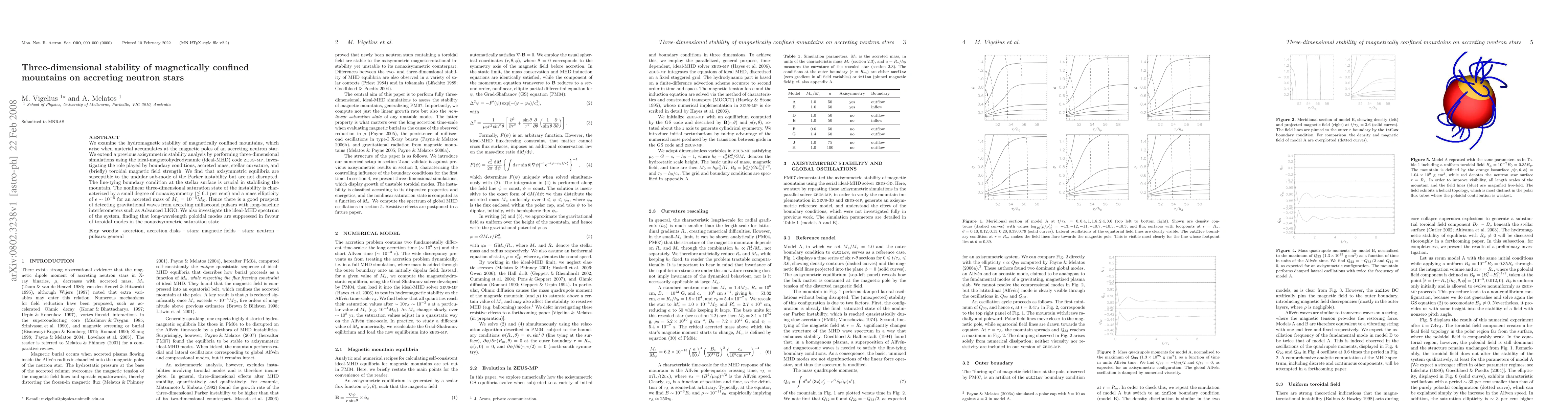 This paper investigates the three-dimensional hydromagnetic stability of magnetically confined mountains on accreting neutron stars, finding that axisymmetric equilibria are stable against the Parker instability due to line-tying boundary conditions. The study suggests a potential for detecting gravitational waves from these systems with advanced interferometers.