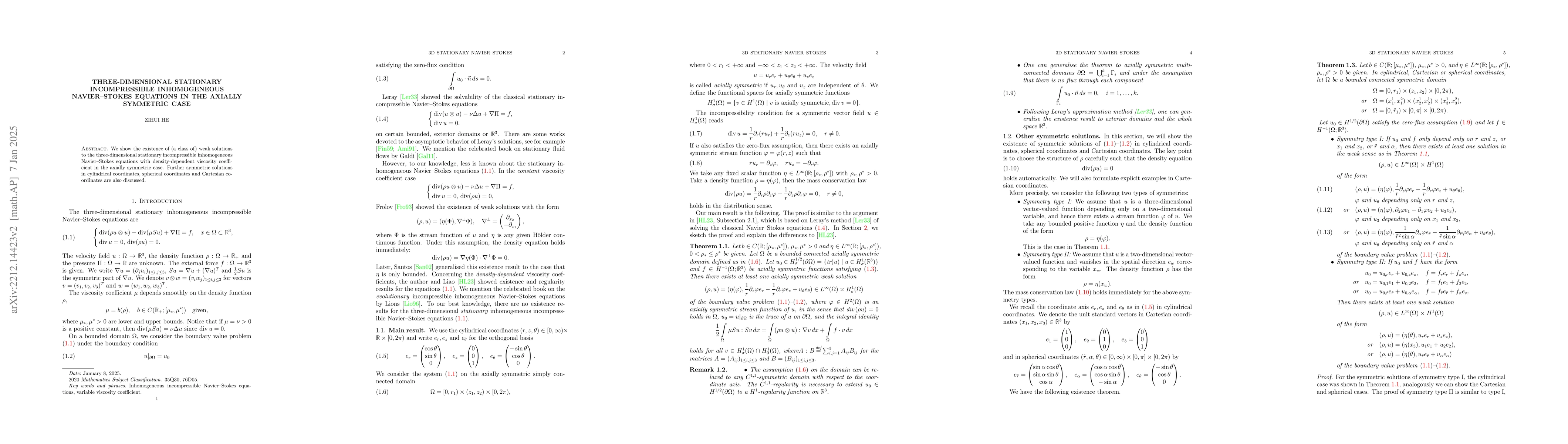 This paper demonstrates the existence of weak solutions to the three-dimensional stationary incompressible Navier-Stokes equations with density-dependent viscosity in the axially symmetric case. It also explores symmetric solutions in cylindrical, spherical, and Cartesian coordinate systems.