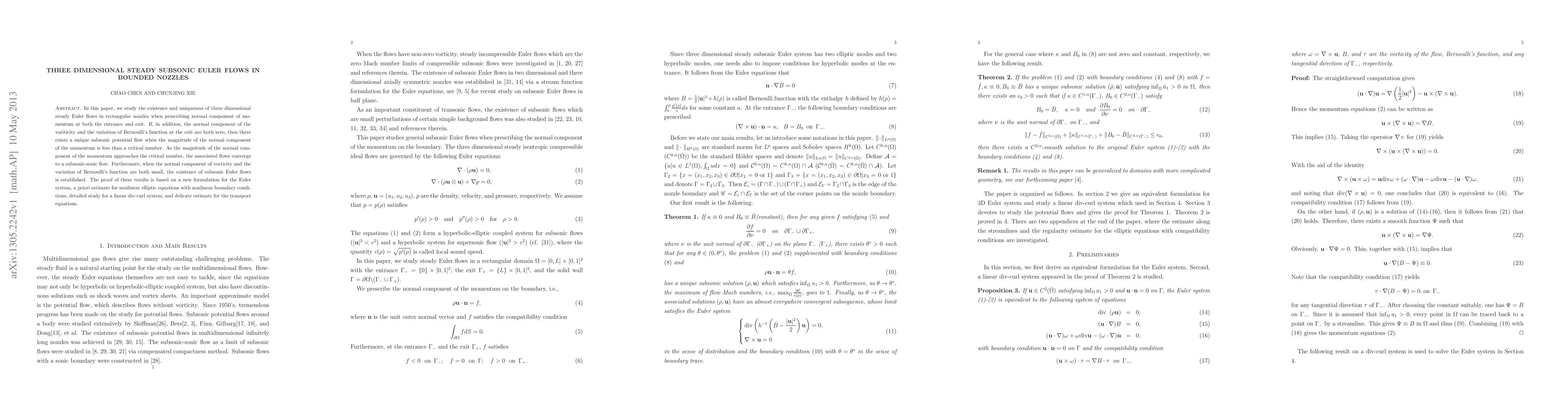 In this paper, we study the existence and uniqueness of three dimensional steady Euler flows in rectangular nozzles when prescribing normal component of momentum at both the entrance and exit. If, in addition, the normal component of the voriticity and the variation of Bernoulli's function at the exit are both zero, then there exists a unique subsonic potential flow when the magnitude of the normal component of the momentum is less than a critical number. As the magnitude of the normal component of the momentum approaches the critical number, the associated flows converge to a subsonic-sonic flow. Furthermore, when the normal component of vorticity and the variation of Bernoulli's function are both small, the existence of subsonic Euler flows is established. The proof of these results is based on a new formulation for the Euler system, a priori estimate for nonlinear elliptic equations with nonlinear boundary conditions, detailed study for a linear div-curl system, and delicate estimate for the transport equations.