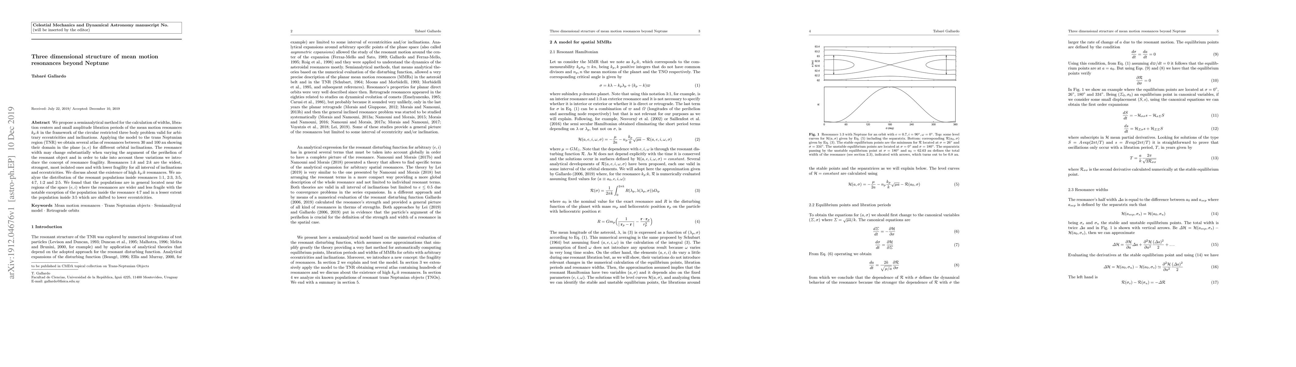 This paper presents a semianalytical method to determine the properties of mean motion resonances beyond Neptune, including widths, libration centers, and periods. It finds that resonances 1:k and 2:k are the widest and least fragile, and analyzes the distribution of trans-Neptunian populations within various resonances, noting shifts in populations for certain resonances.