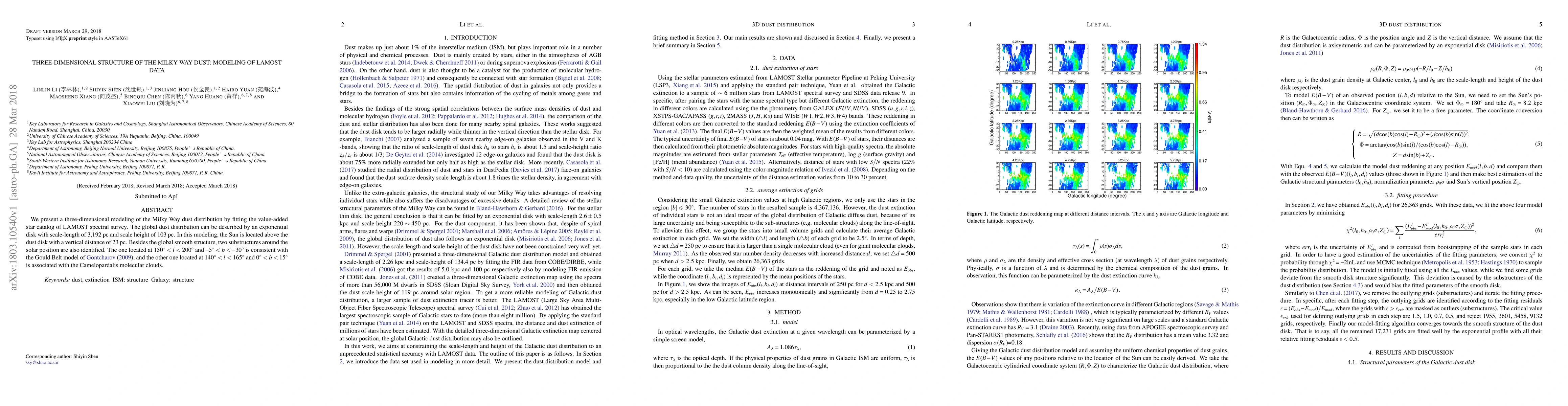 This paper models the three-dimensional distribution of Milky Way dust using LAMOST spectral survey data, finding an exponential disk with a scale-length of 3,192 pc and scale height of 103 pc. The Sun is positioned above the dust disk with a vertical distance of 23 pc, and two dust substructures are identified, correlating with the Gould Belt and Camelopardalis molecular clouds.