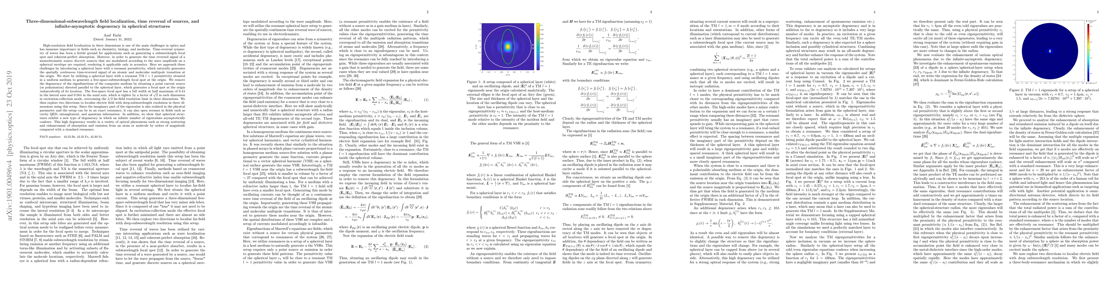 This paper explores high-resolution three-dimensional field localization using spherical structures with resonant permittivity, achieving a focal spot tighter than the far-field resolution limit. It also reveals an infinite-asymptotic degeneracy in spherical structures, leading to significant optical phenomena.