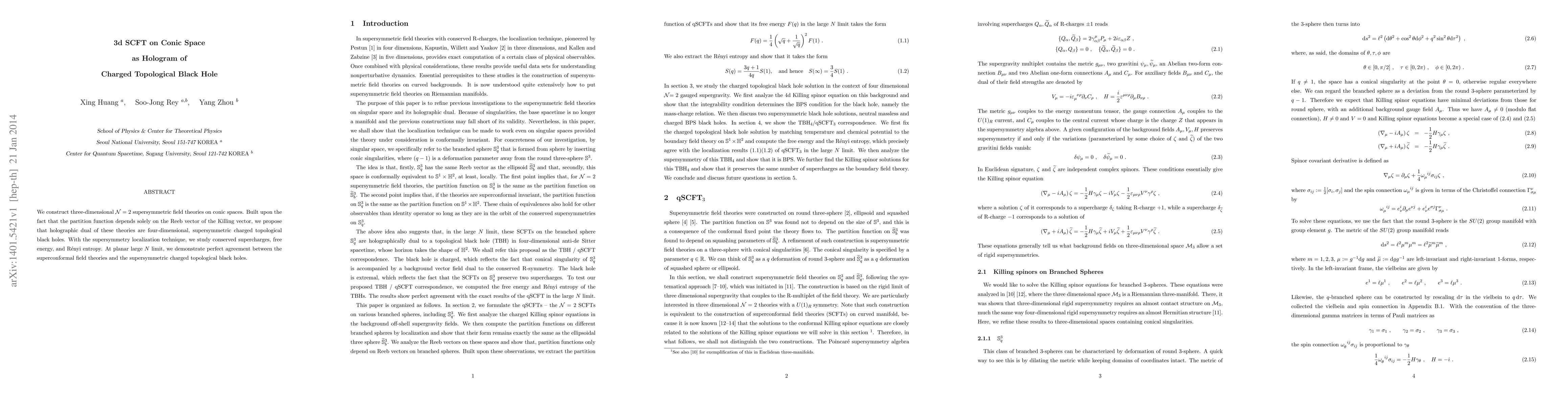 This paper constructs three-dimensional N=2 supersymmetric conformal field theories on conic spaces and proposes that their holographic duals are four-dimensional supersymmetric charged topological black holes. Using localization techniques, it confirms the equivalence between these field theories and black holes at the large N limit.