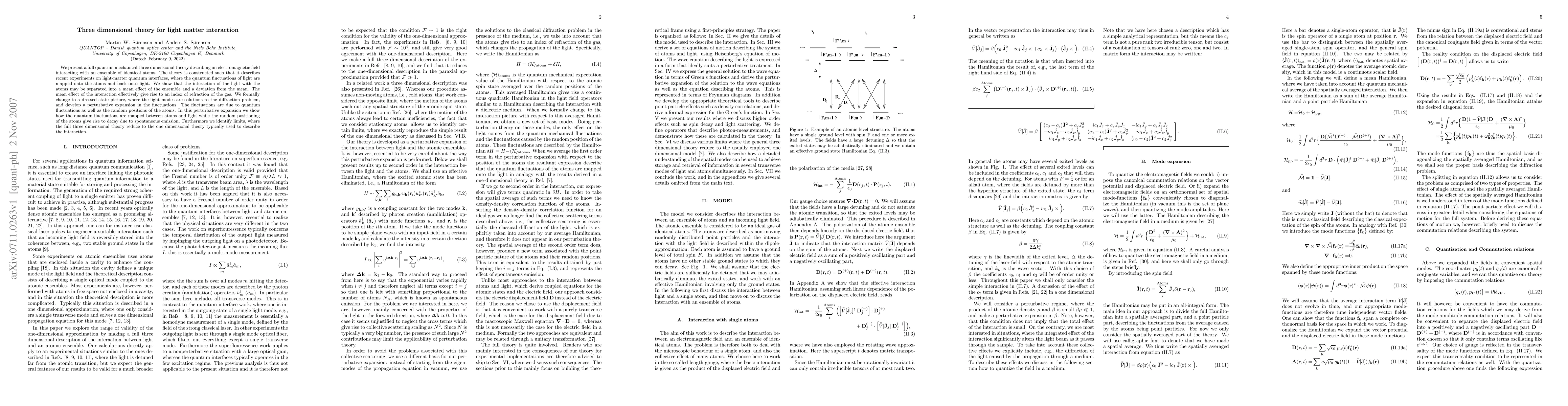 We present a full quantum mechanical three dimensional theory describing an electromagnetic field interacting with an ensemble of identical atoms. The theory is constructed such that it describes recent experiments on light-matter quantum interfaces, where the quantum fluctuations of light are mapped onto the atoms and back onto light. We show that the interaction of the light with the atoms may be separated into a mean effect of the ensemble and a deviation from the mean. The mean effect of the interaction effectively give rise to an index of refraction of the gas. We formally change to a dressed state picture, where the light modes are solutions to the diffraction problem, and develop a perturbative expansion in the fluctuations. The fluctuations are due to quantum fluctuations as well as the random positions of the atoms. In this perturbative expansion we show how the quantum fluctuations are mapped between atoms and light while the random positioning of the atoms give rise to decay due to spontaneous emission. Furthermore we identify limits, where the full three dimensional theory reduce to the one dimensional theory typically used to describe the interaction.