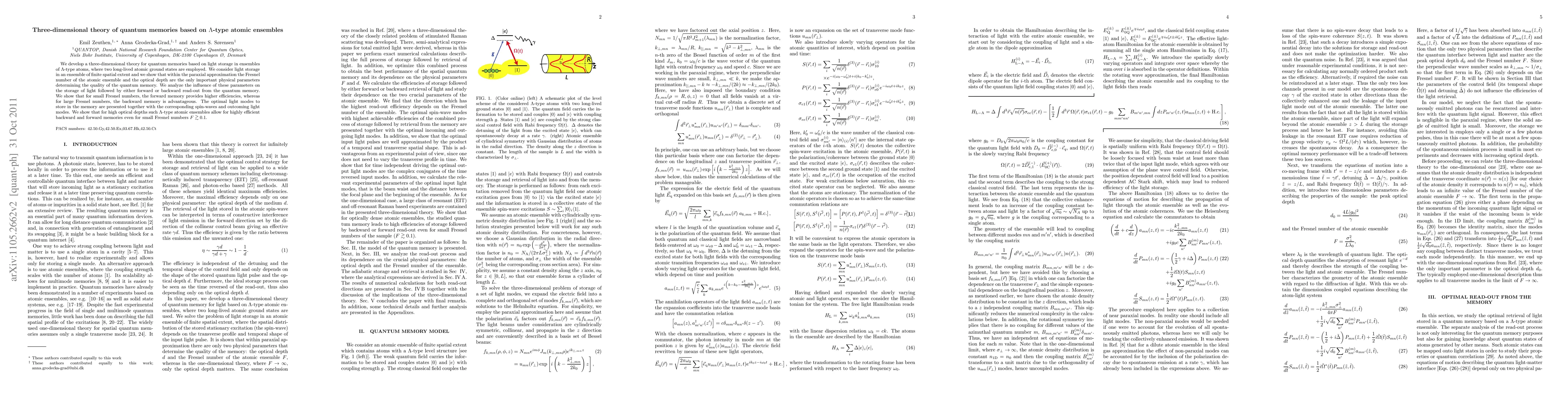 This paper develops a three-dimensional theory for quantum memories using Lambda-type atomic ensembles, identifying Fresnel number and optical depth as key parameters. It shows that forward memory is more efficient for small Fresnel numbers, while backward memory is better for large Fresnel numbers, and presents optimal light modes for efficient storage.