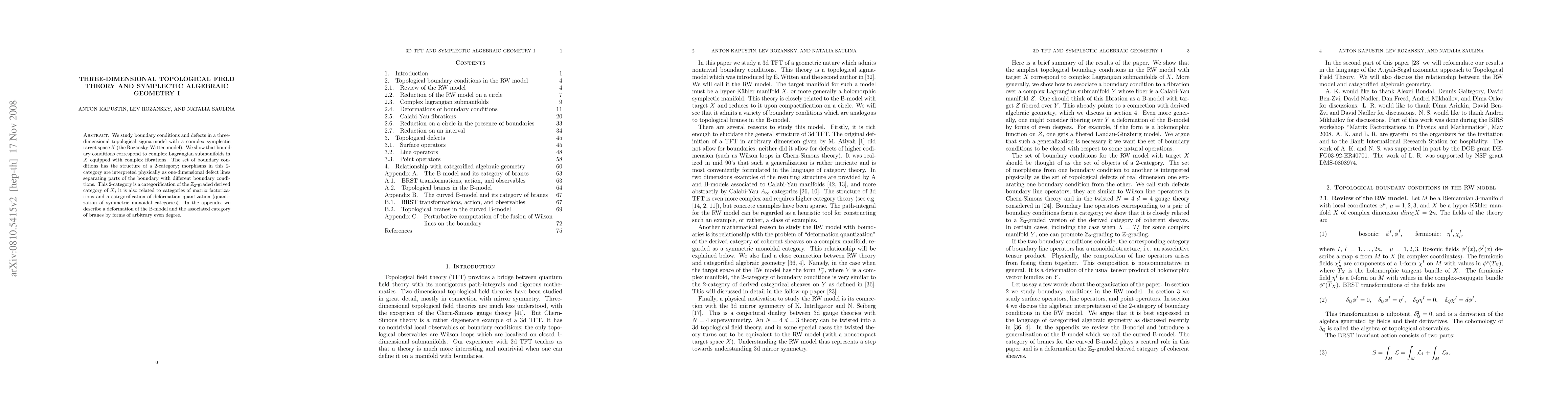 This paper explores boundary conditions and defects in a three-dimensional topological sigma-model, revealing that they correspond to Lagrangian submanifolds in a complex symplectic space. The boundary conditions form a 2-category, categorifying the Z/2-graded derived category of the target space and linking to matrix factorizations and deformation quantization.