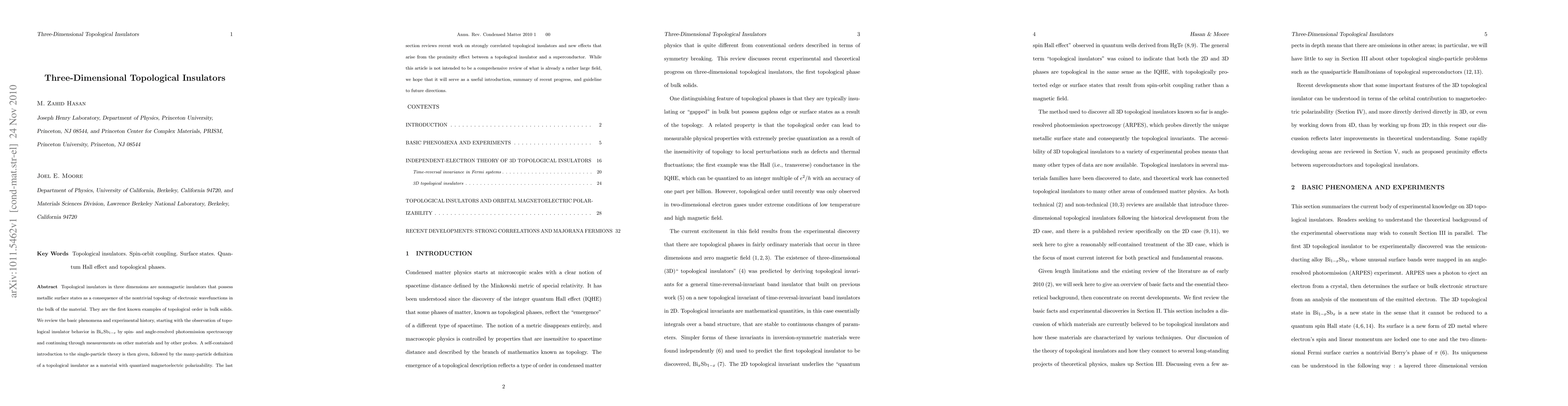 This paper provides an introduction to three-dimensional topological insulators, reviewing their basic phenomena and experimental history, including the first observations in Bi$_x$Sb$_{1-x}$. It also covers the theoretical framework and recent developments in strongly correlated topological insulators and their interactions with superconductors.