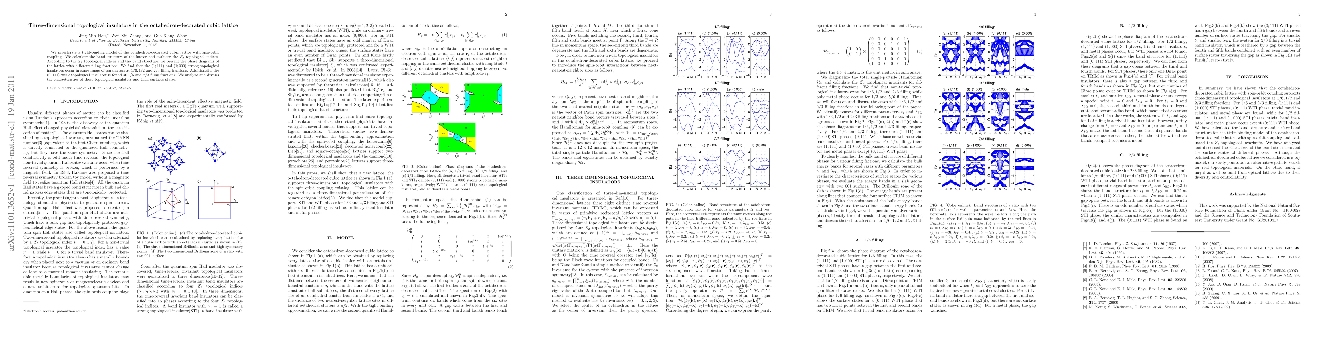 The paper presents a detailed analysis of a tight-binding model on the octahedron-decorated cubic lattice, identifying various topological insulator phases using Z_2 topological indices.