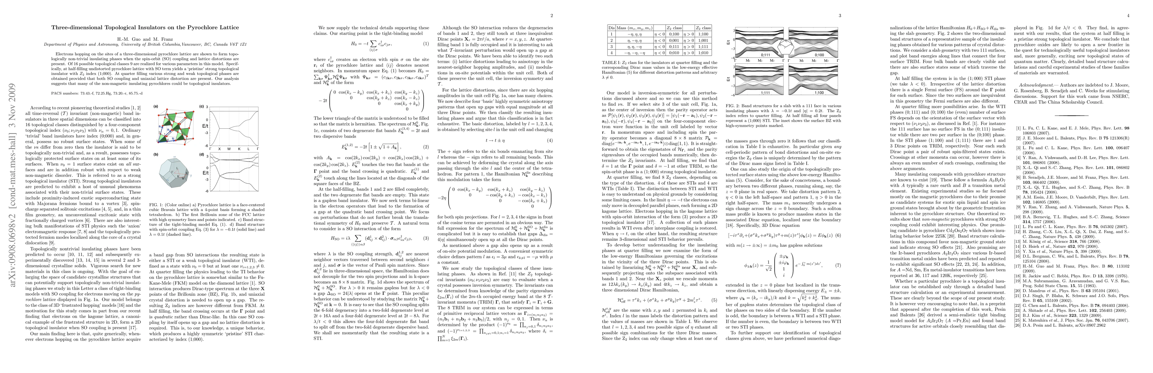 This paper demonstrates that electrons on a three-dimensional pyrochlore lattice can form topologically non-trivial insulating phases when spin-orbit coupling and lattice distortions are present, identifying 9 out of 16 possible topological classes. At half-filling, a strong topological insulator with a Z2 index is realized, while at quarter filling, various strong and weak topological phases emerge with the presence of both spin-orbit coupling and uniaxial lattice distortion.