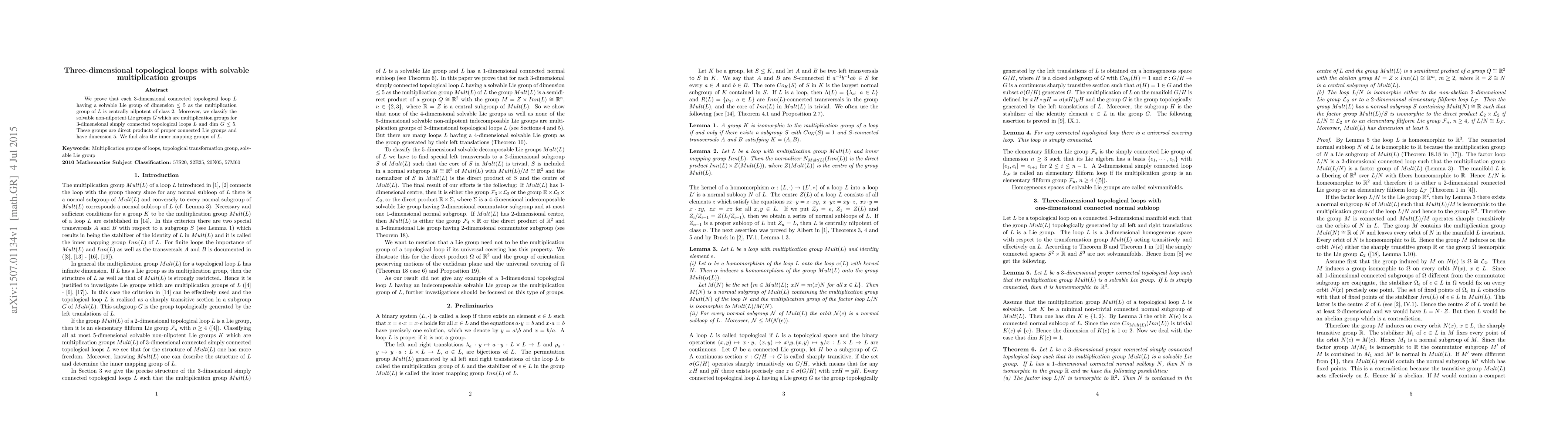 Researchers prove that 3D topological loops with solvable Lie groups of dimension ≤ 5 are centrally nilpotent of class 2, and classify non-nilpotent groups as direct products of proper connected Lie groups.