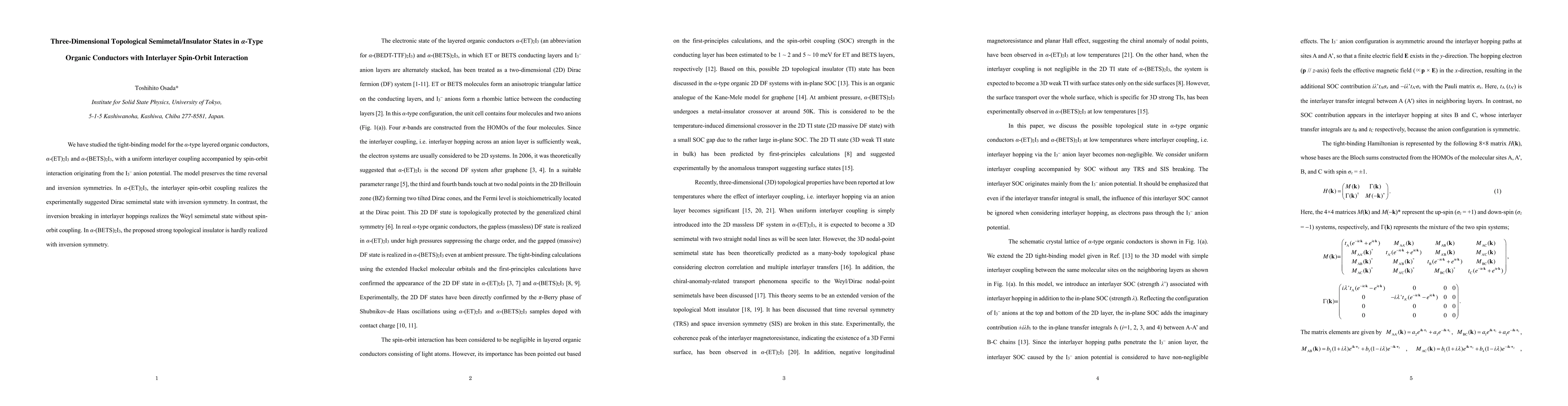 This study explores the topological states in α-type organic conductors, showing that interlayer spin-orbit coupling in \alpha-(ET)2I3 leads to a Dirac semimetal, while inversion-breaking in interlayer hoppings in \alpha-(BETS)2I3 produces a Weyl semimetal; the latter does not support a strong topological insulator with inversion symmetry.