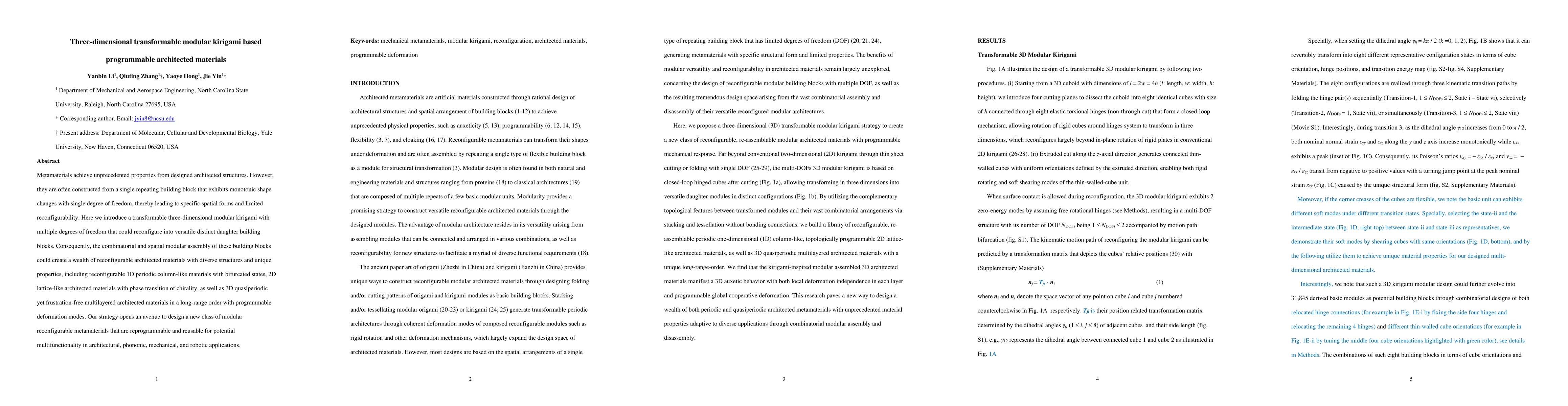This paper introduces a novel three-dimensional modular kirigami approach to create reconfigurable architected materials with multiple degrees of freedom, enabling diverse structural transformations and multifunctional applications in architecture, phononics, mechanics, and robotics. The proposed strategy allows for the assembly of versatile building blocks into various programmable forms and deformation modes.
