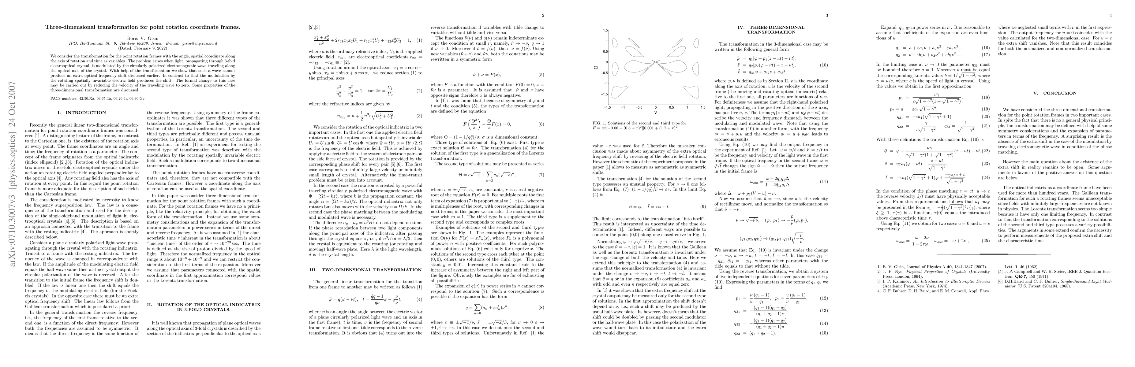 We consider the transformation for the point rotation frames with the angle, spatial coordinate along the axis of rotation and time as variables. The problem arises when light, propagating through 3-fold electrooptical crystal, is modulated by the circularly polarized electromagnetic wave traveling along the optical axis of the crystal. With help of the transformation we show that such a wave cannot produce an extra optical frequency shift discussed earlier. In contrast to that the modulation by the rotating spatially invariable electric field produces the shift. The formal change to this case may be carried out by reducing the velocity of the traveling wave to zero. Some properties of the three-dimensional transformation are discussed.