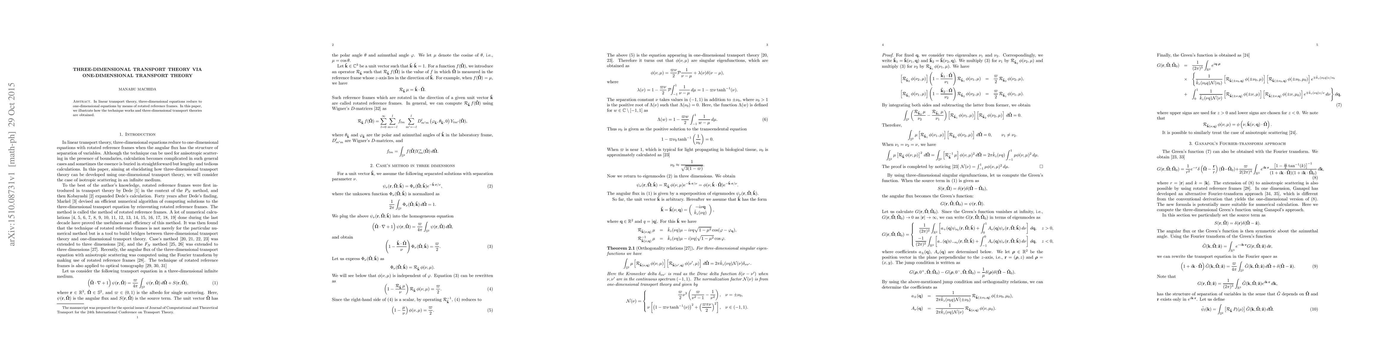 In linear transport theory, three-dimensional equations reduce to one-dimensional equations by means of rotated reference frames. In this paper, we illustrate how the technique works and three-dimensional transport theories are obtained.