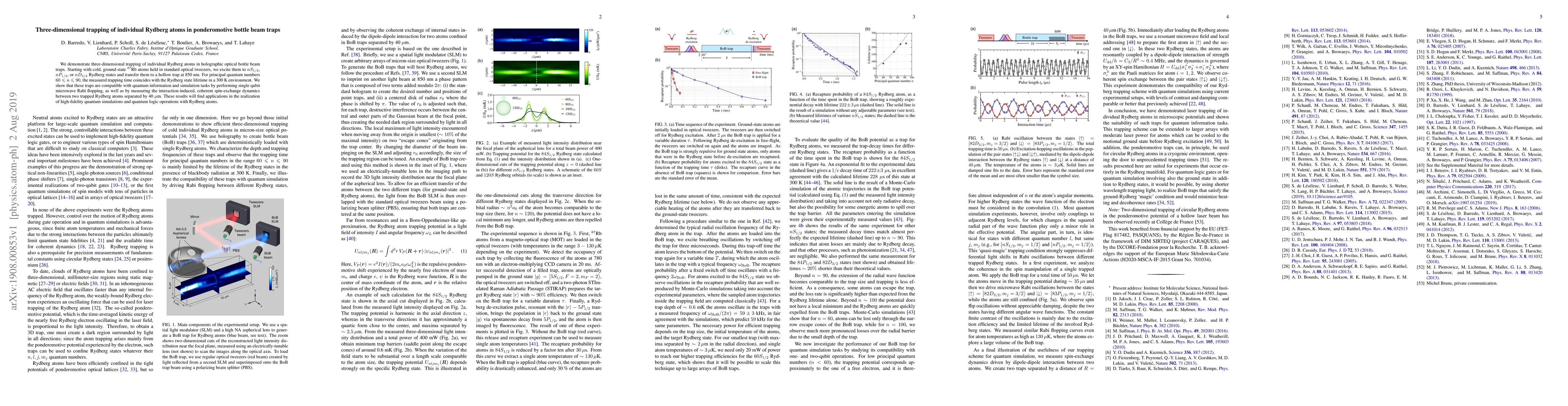 This paper demonstrates the three-dimensional trapping of individual Rydberg atoms in holographic optical bottle beam traps, showing compatibility for quantum information tasks through single qubit operations and coherent spin-exchange dynamics. The findings enable high-fidelity quantum simulations and logic operations with Rydberg atoms.