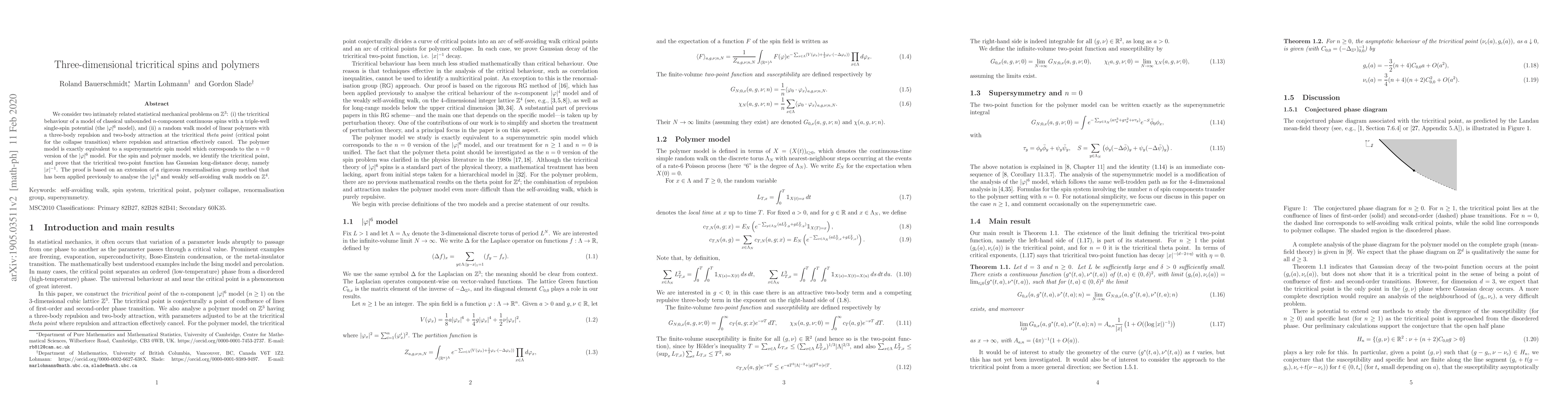We consider two intimately related statistical mechanical problems on $\mathbb{Z}^3$: (i) the tricritical behaviour of a model of classical unbounded $n$-component continuous spins with a triple-well single-spin potential (the $|\varphi|^6$ model), and (ii) a random walk model of linear polymers with a three-body repulsion and two-body attraction at the tricritical theta point (critical point for the collapse transition) where repulsion and attraction effectively cancel. The polymer model is exactly equivalent to a supersymmetric spin model which corresponds to the $n=0$ version of the $|\varphi|^6$ model. For the spin and polymer models, we identify the tricritical point, and prove that the tricritical two-point function has Gaussian long-distance decay, namely $|x|^{-1}$. The proof is based on an extension of a rigorous renormalisation group method that has been applied previously to analyse the $|\varphi|^4$ and weakly self-avoiding walk models on $\mathbb{Z}^4$.