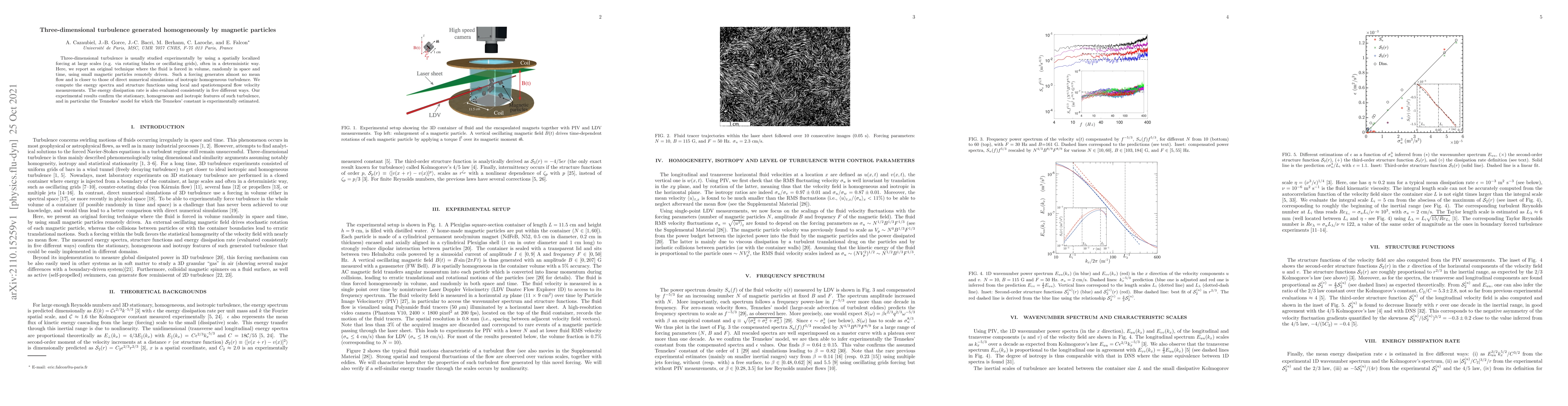 This paper introduces a novel technique to generate three-dimensional turbulence in a fluid by using magnetic particles driven remotely, creating a homogeneous and isotropic turbulence model. Experimental results confirm the stationary and isotropic nature of the turbulence, with an estimation of Tennekes' constant.