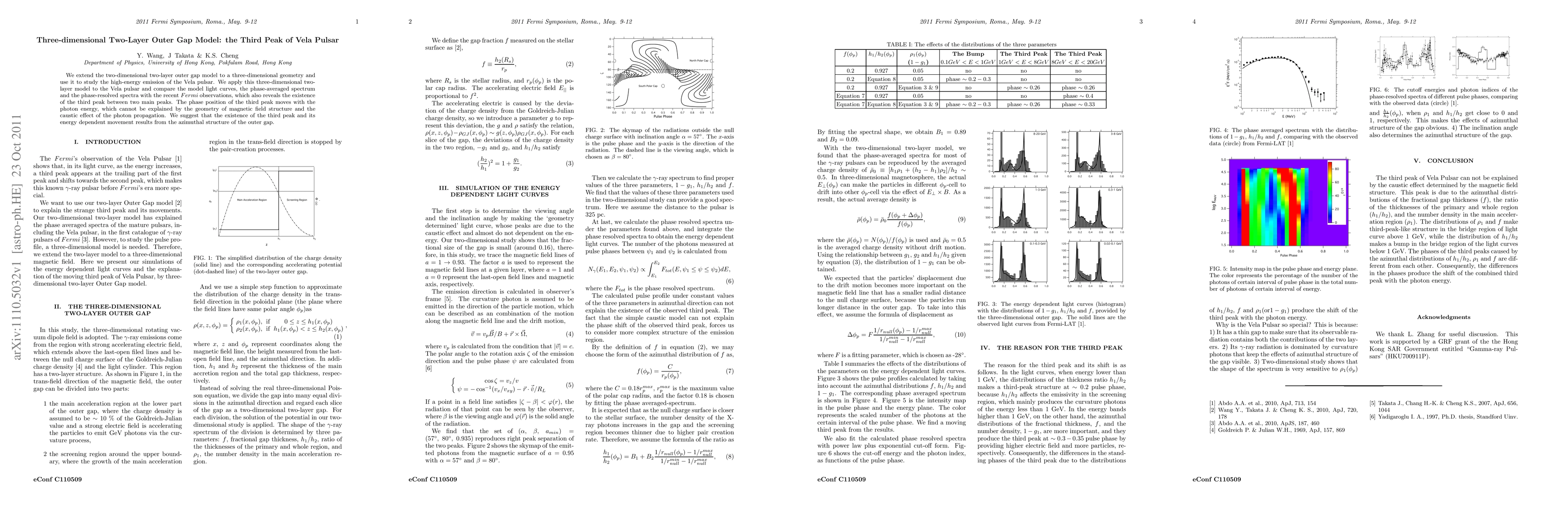 This paper extends a two-dimensional two-layer outer gap model to a three-dimensional framework to study the high-energy emission of the Vela pulsar. The model's predictions are compared with recent Fermi observations, revealing a third emission peak whose phase position shifts with photon energy, suggesting an azimuthal structure in the pulsar's outer gap.