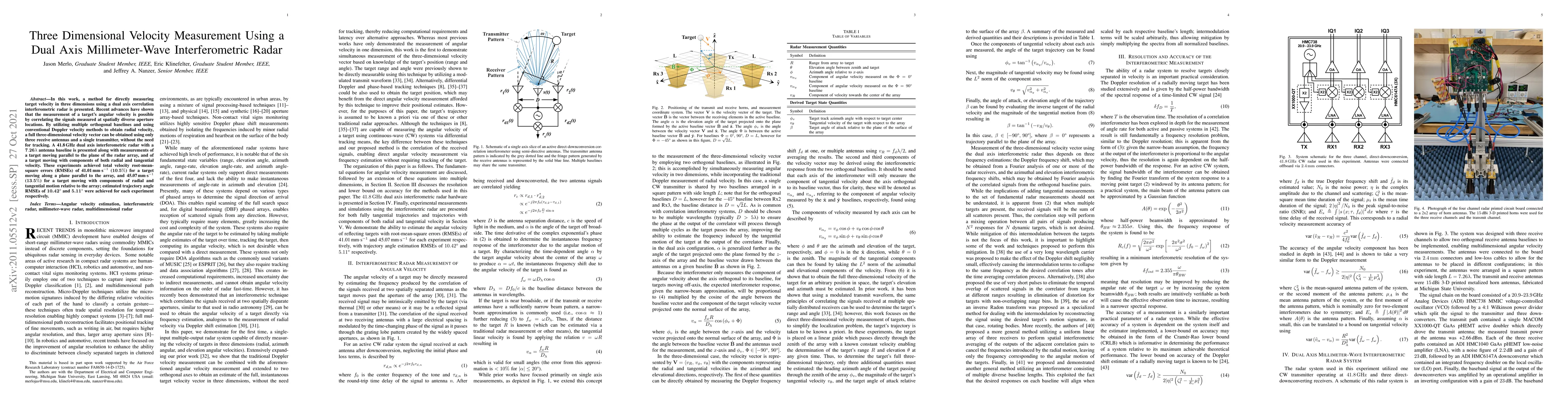 This paper presents a method for measuring three-dimensional target velocity using a dual axis interferometric radar, achieving RMSE of 41.01 mm/s for parallel motion and 45.07 mm/s for radial and tangential motion, with a single transmitter and three receive antennas.