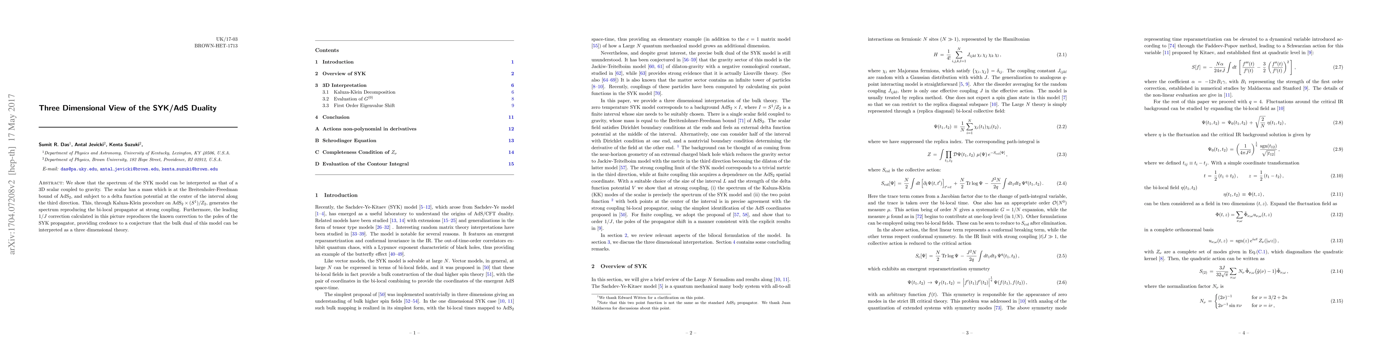 This paper demonstrates that the SYK model's spectrum corresponds to a 3D scalar coupled to gravity, with a mass at the Breitenholer-Freedman bound in AdS$_2$. The Kaluza-Klein procedure on AdS$_2 \times (S^1)/Z_2$ reproduces the SYK propagator, supporting the conjecture of a 3D bulk dual.